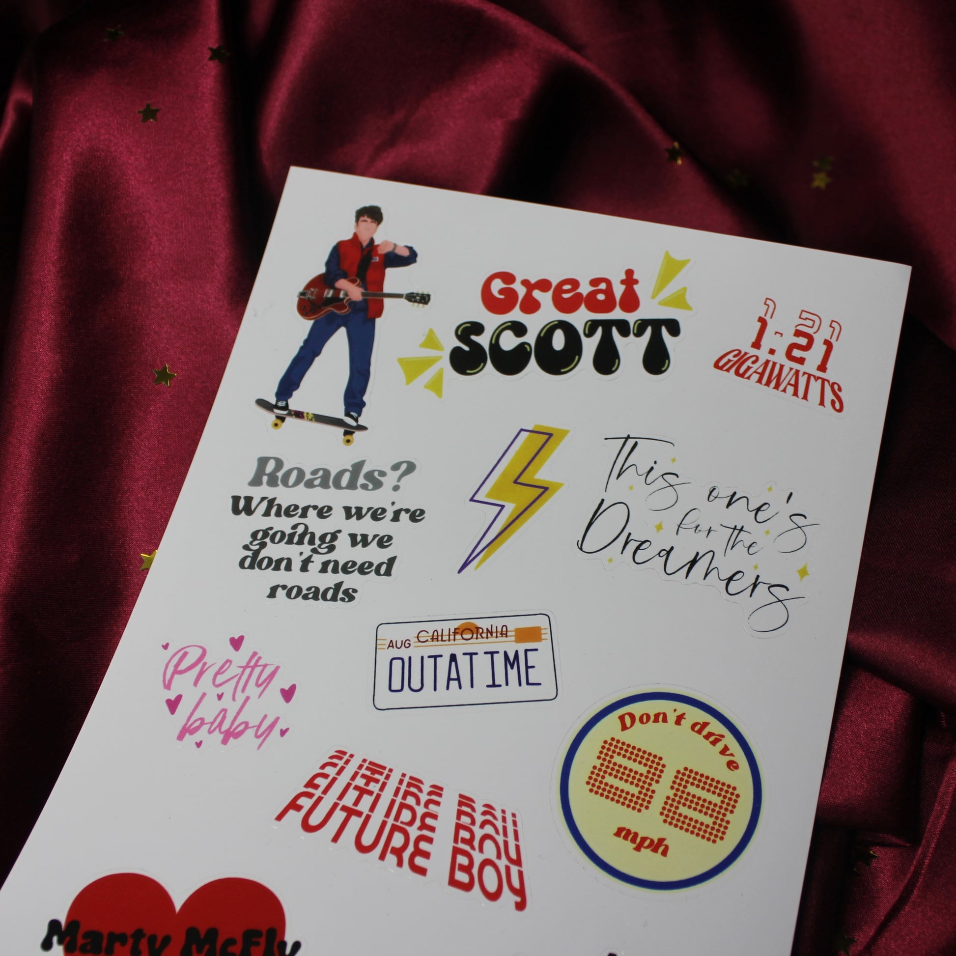 This sticker sheet celebrates Back to the Future The Musical with lots of quotes, pictures and doodles. Illustrations drawn by Vic from I can’t draw faces (@icant_drawfaces on Instagram).