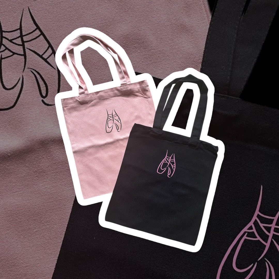 This design features a small line drawing of pointe shoes printed in the centre of the bag. This bag comes in pink or black, please select your colour.