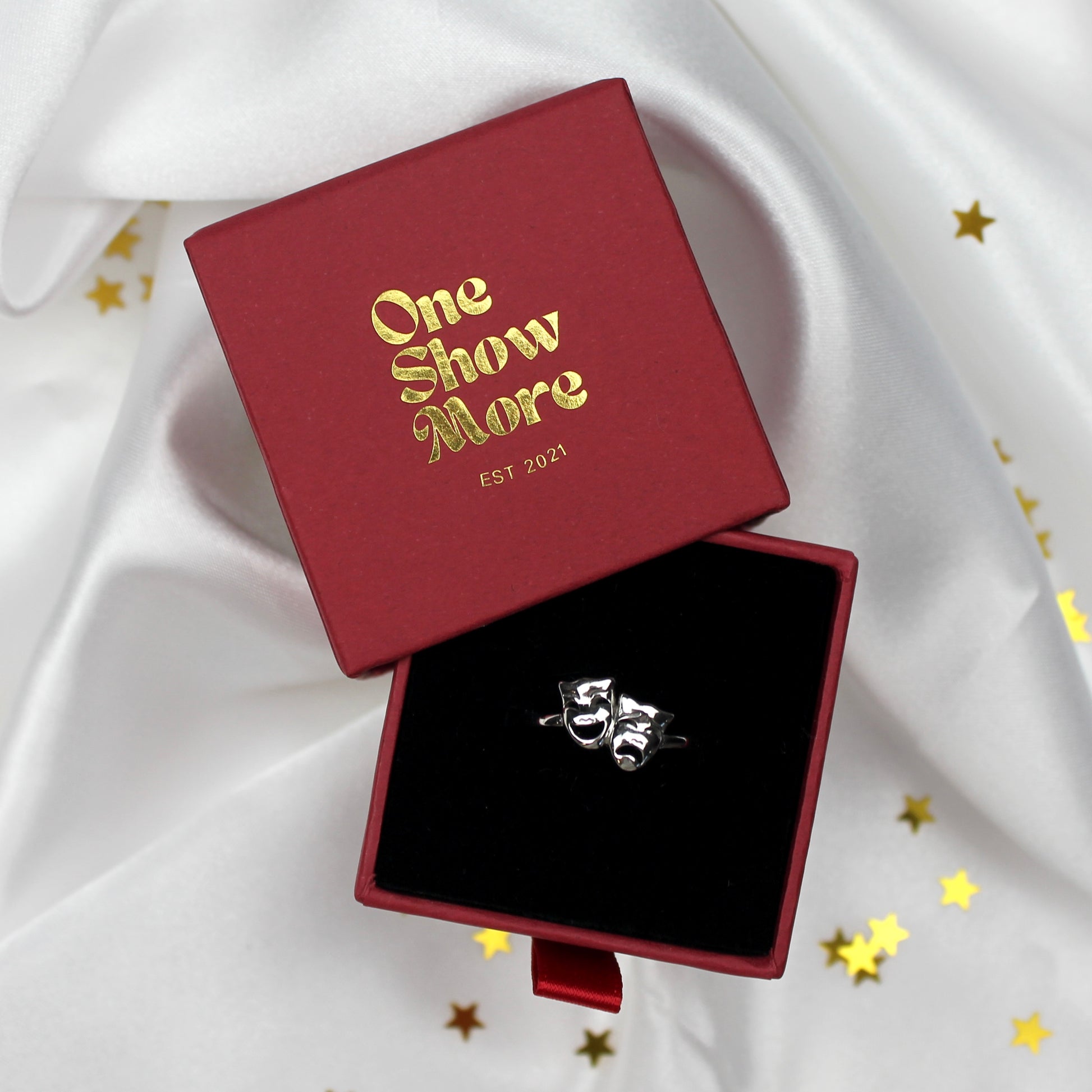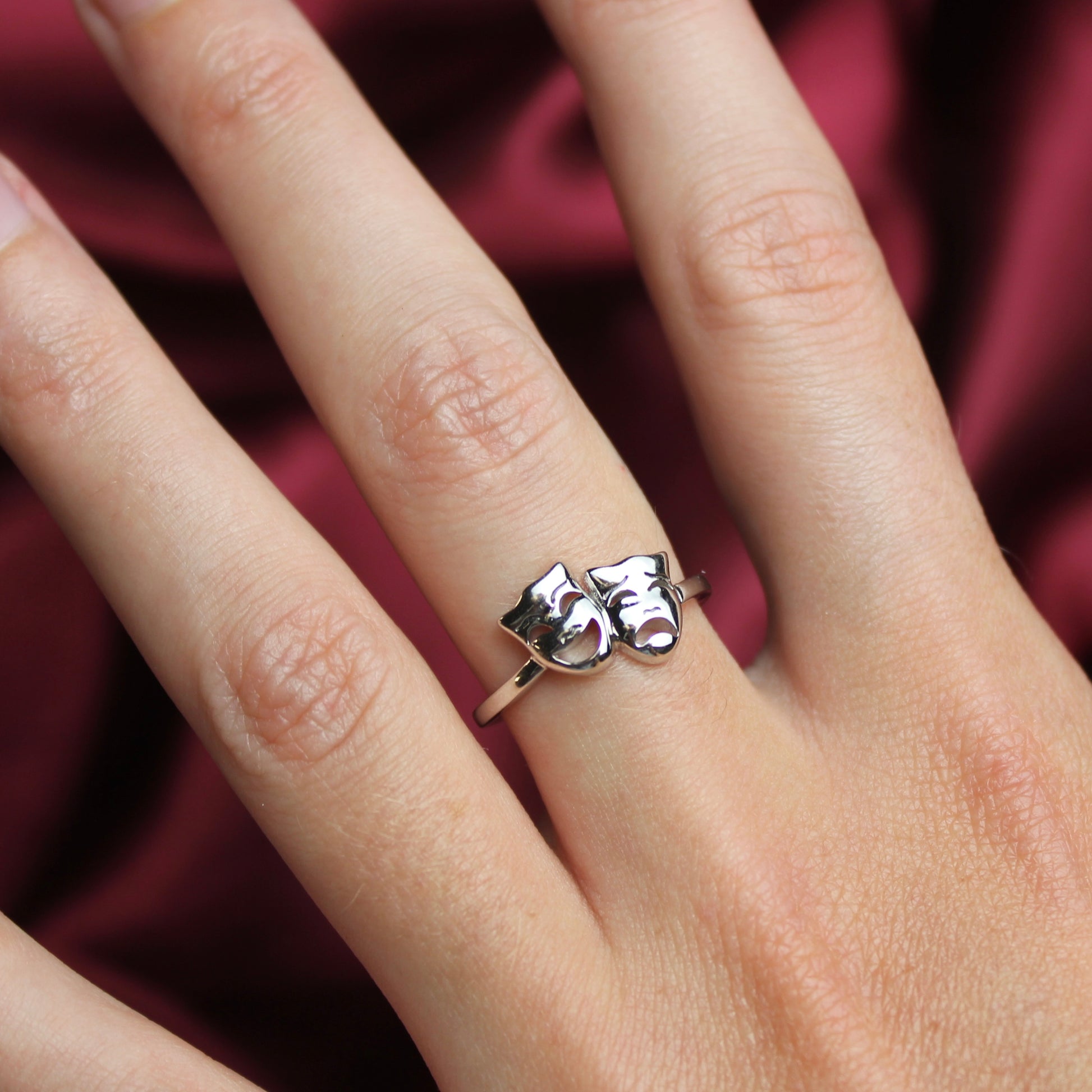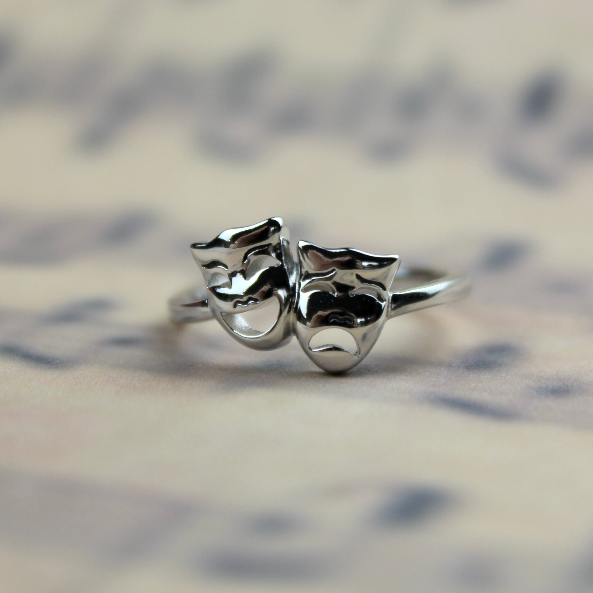 Sterling silver comedy and tragedy ring, available in 3 sizes.