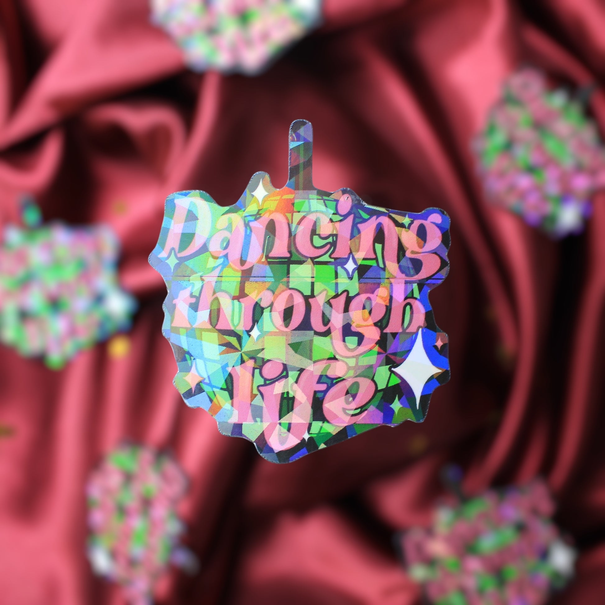 This sticker is my hand drawn design of a green disco ball along with ‘Daning through life’ the classic quote from Wicked The Musical.