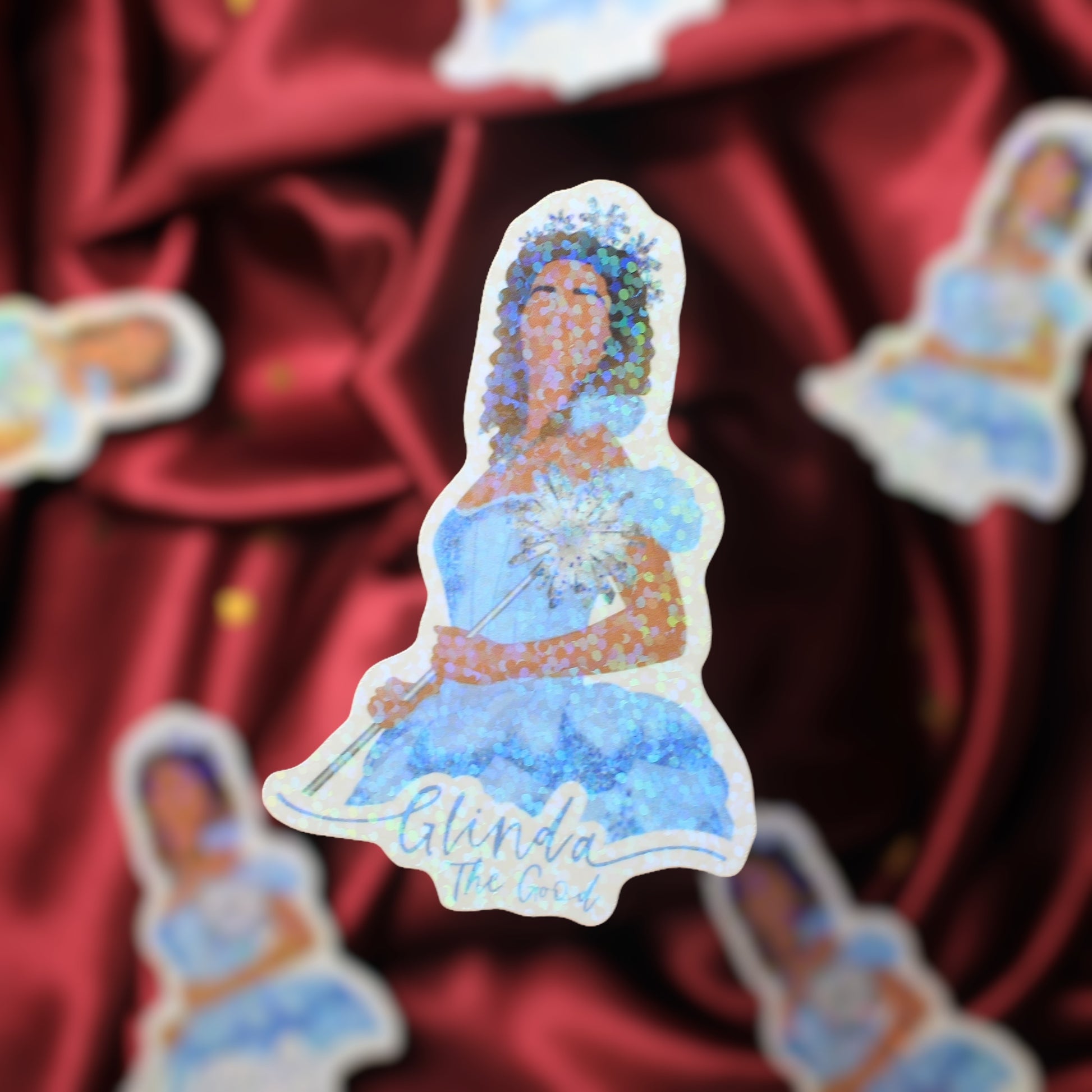 This sticker pictures Glinda The Good Witch from Wicked The Musical with a holographic finish. Illustrations drawn by Vic from I can’t draw faces (@icant_drawfaces on Instagram).