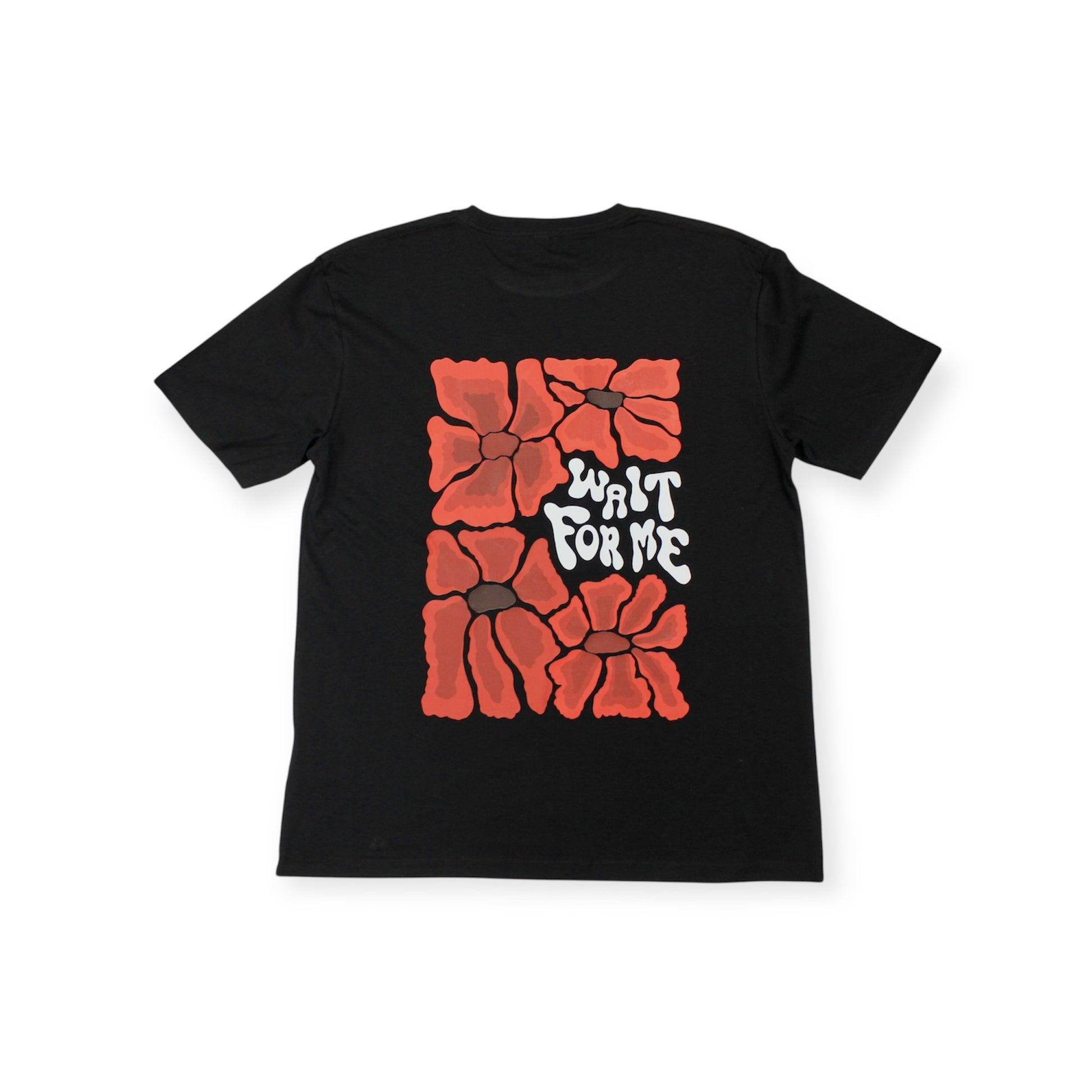 This 100% cotton T-shirt features the a hand drawn carnation on the front chest and a large hand drawn design on the back. The design features the classic lyrics ‘wait for me’ among hand drawn red carnation flowers in a retro style.