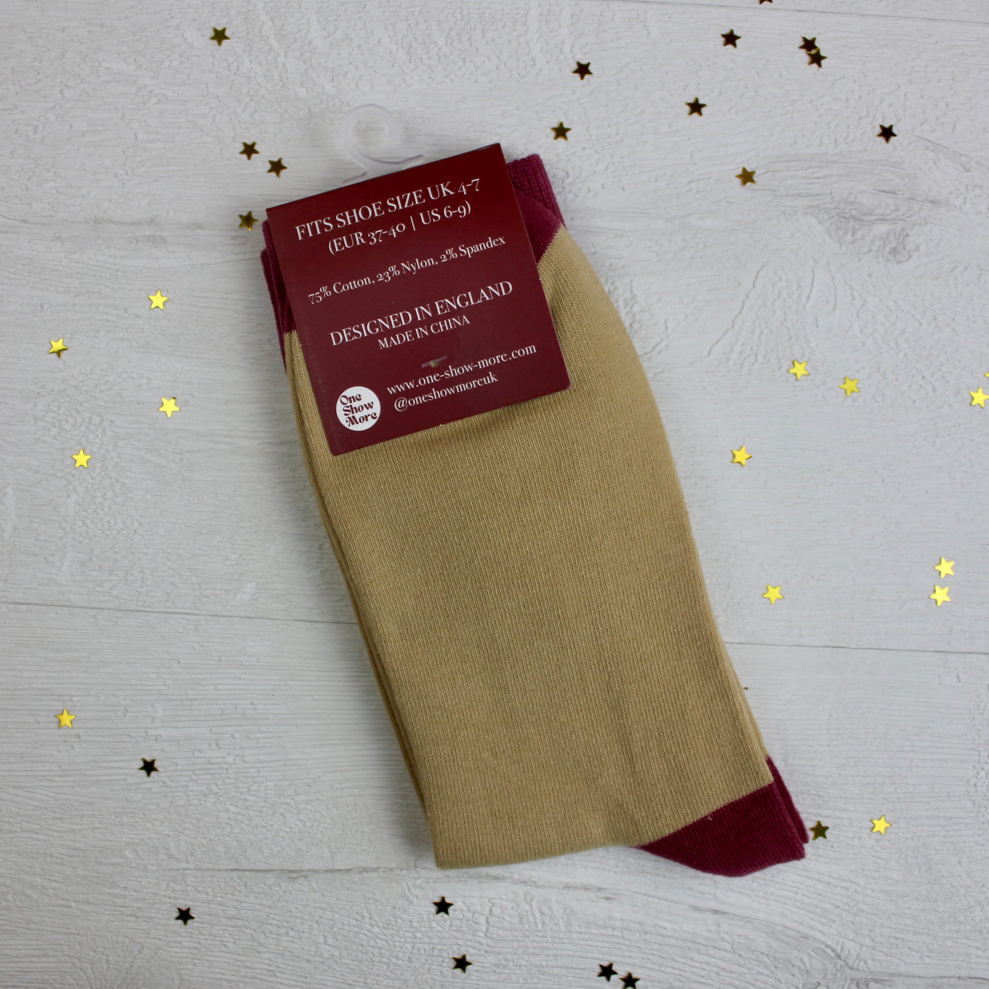 These Hamilton The Musical themed crew socks feature the lyrics ‘young, scrappy and hungry’ on a sand coloured sock.