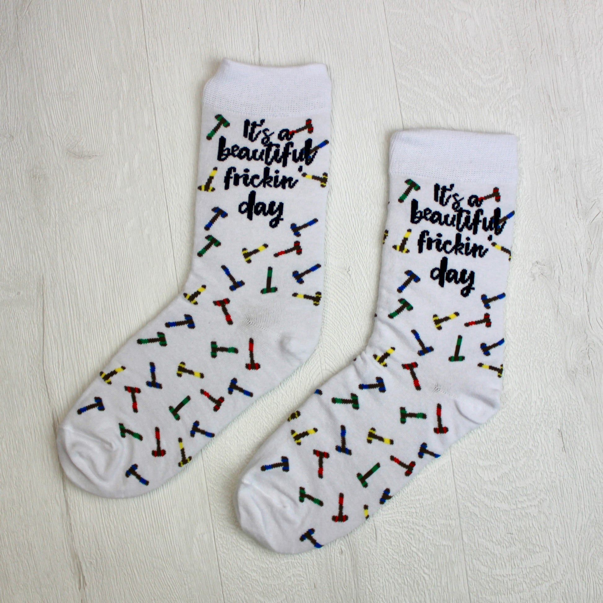 These Heathers The Musical themed crew socks feature the lyrics ‘it’s a beautiful frickin in day’ along with croquet mallets in the 4 colours of the heathers and Veronica.