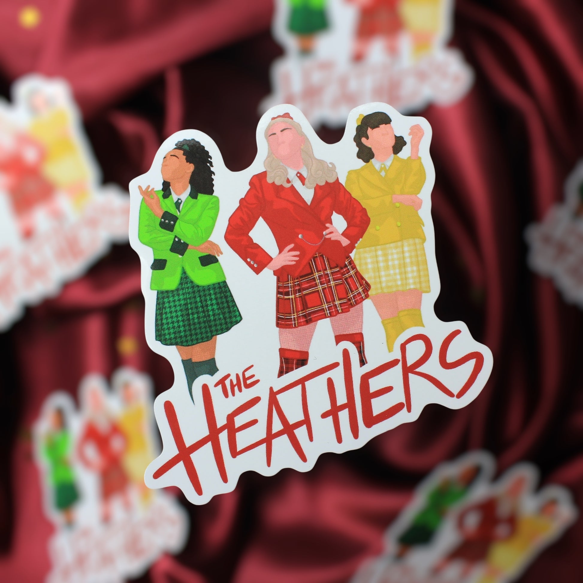 This sticker pictures The three Heathers from Heathers The Musical with a glossy finish. Illustrations drawn by Vic from I can’t draw faces (@icant_drawfaces on Instagram).