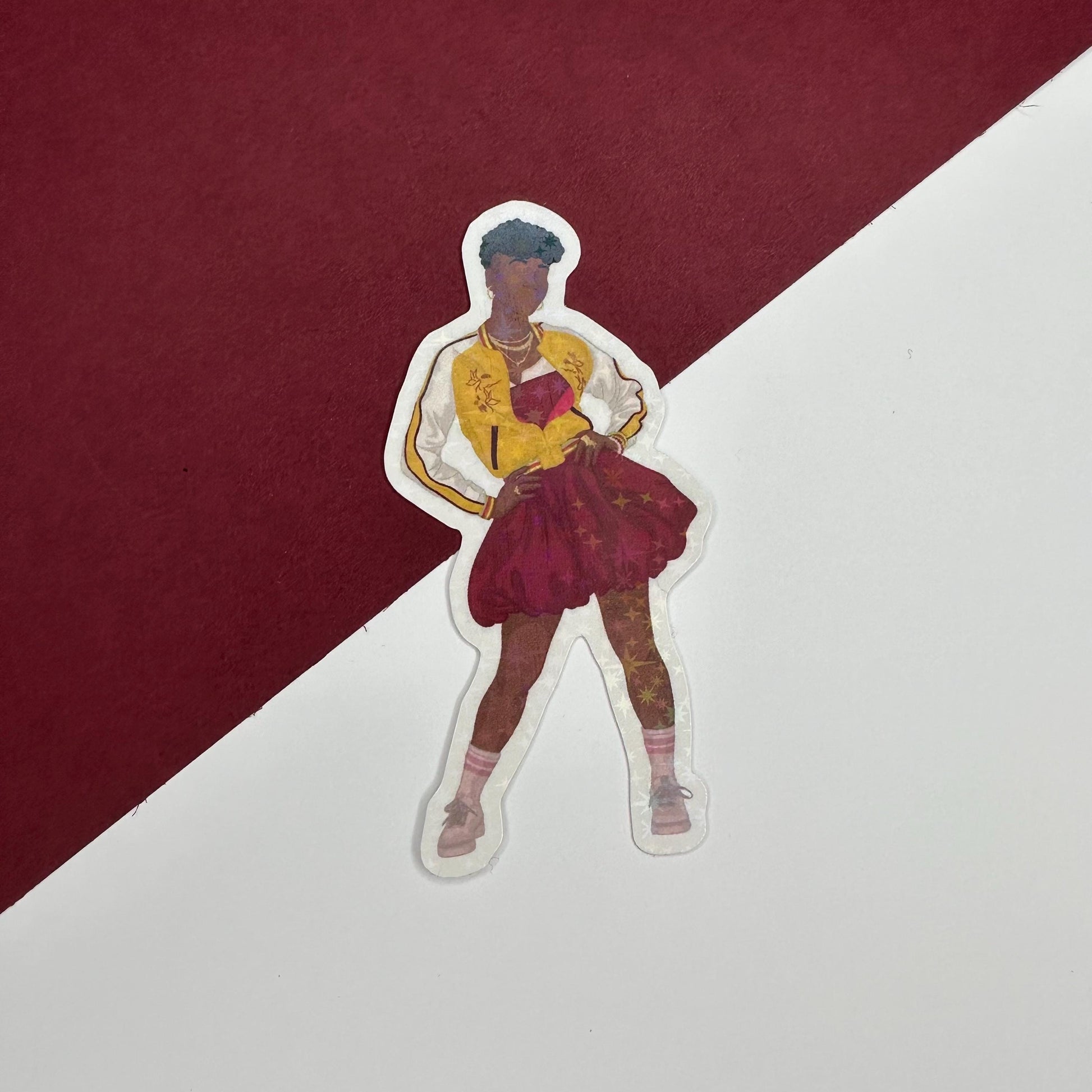 This sticker pictures Juliet from &Juliet The Musical with a holographic finish. Illustrations drawn by Vic from I can’t draw faces (@icant_drawfaces on Instagram).