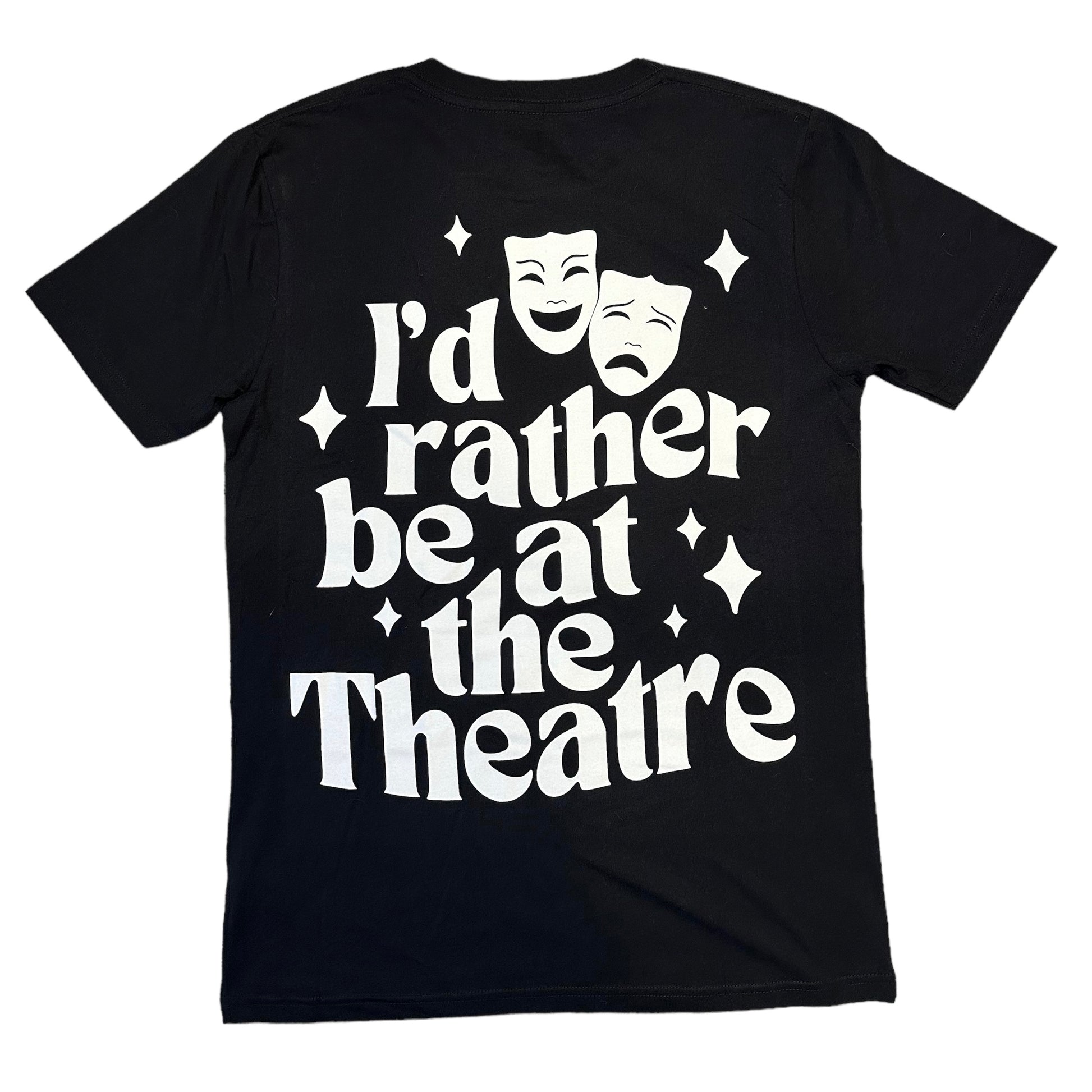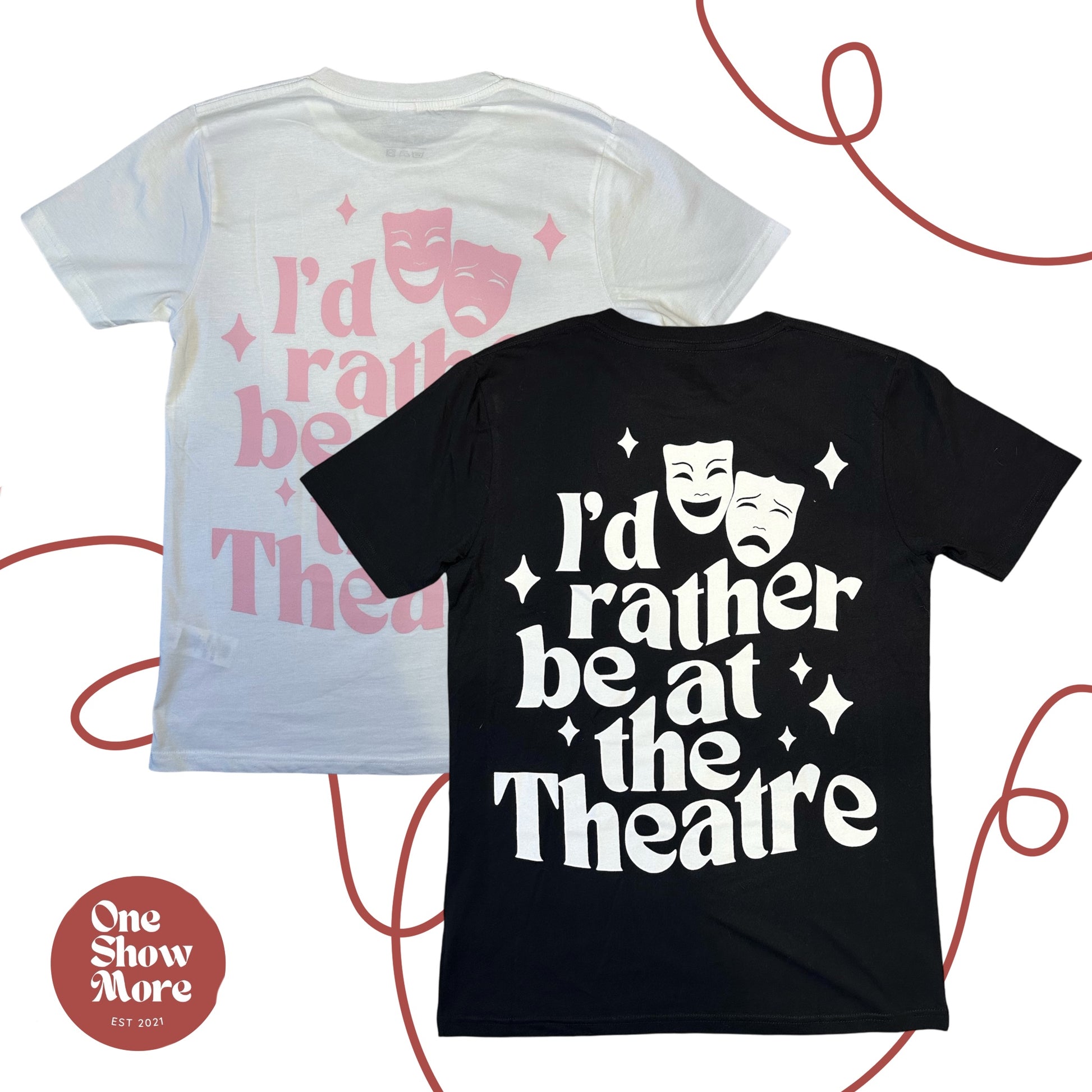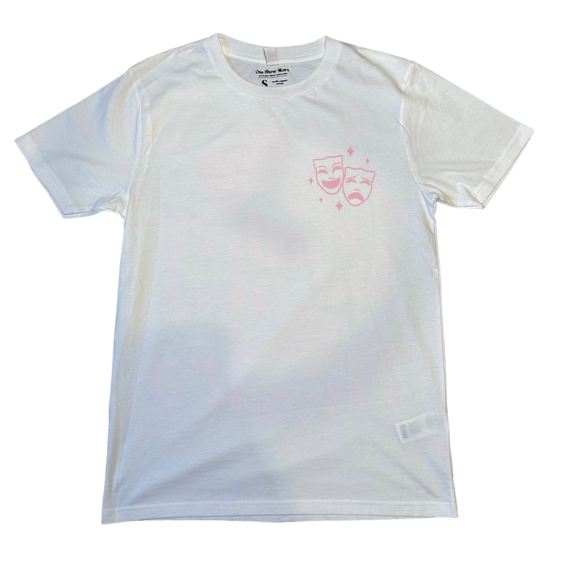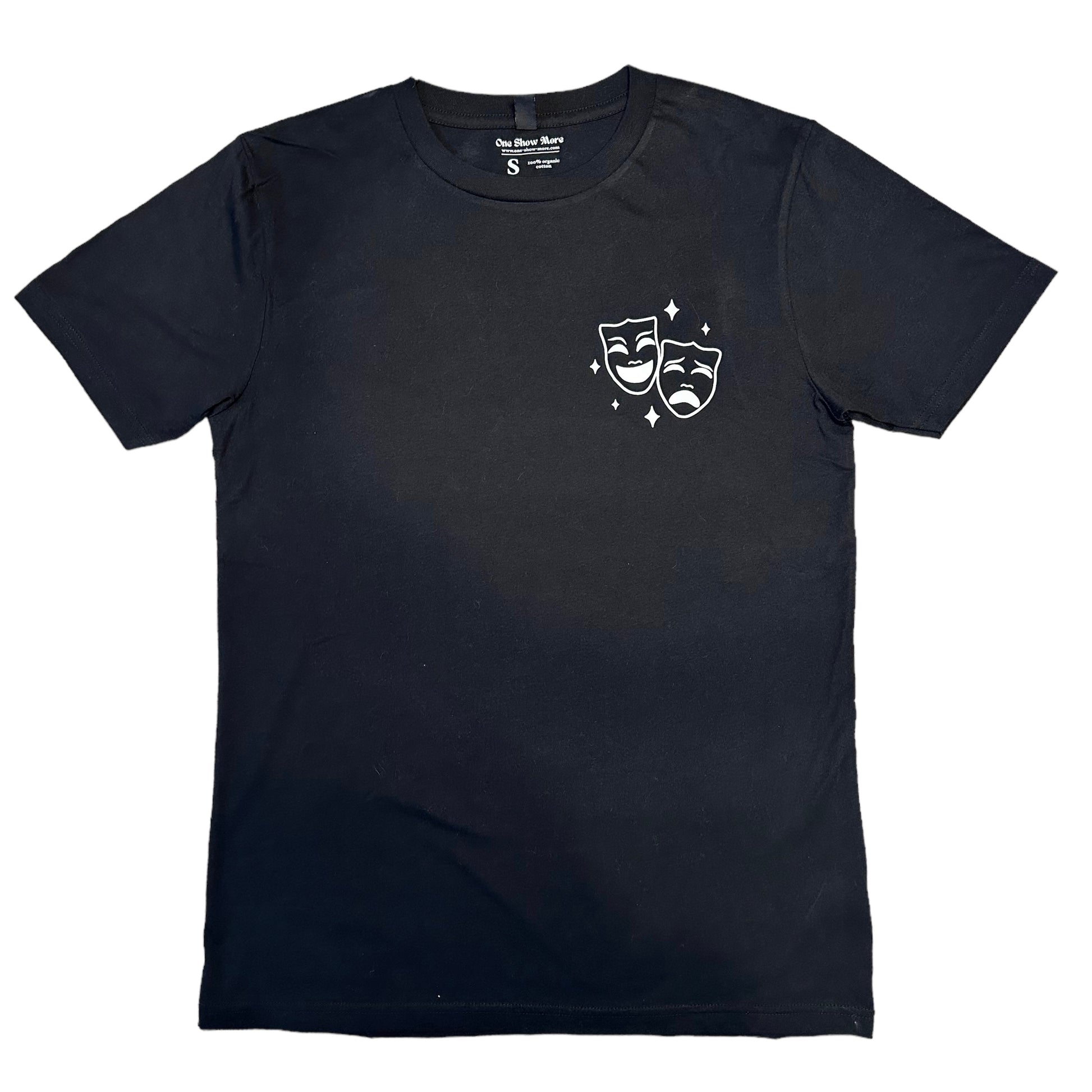 Cotton T-shirt in your choice of colour with theatre faces printed on the right chest and a quote printed on the back. Available in sizes small to extra extra large.