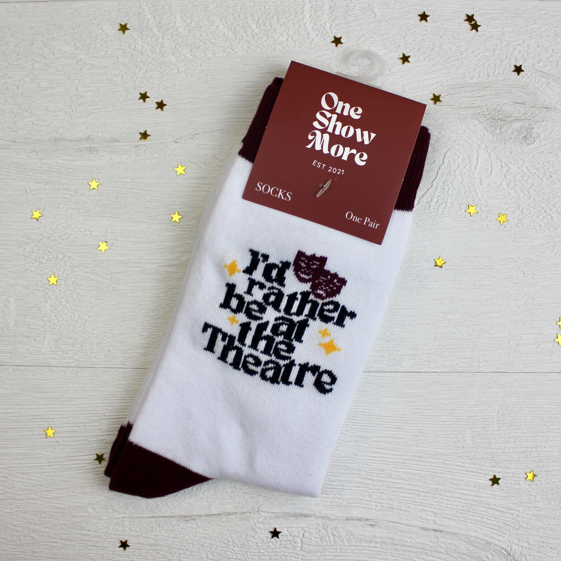 These theatre themed crew socks feature our bestselling design ‘I’d rather be at the Theatre’ on a white sock with deep red details.