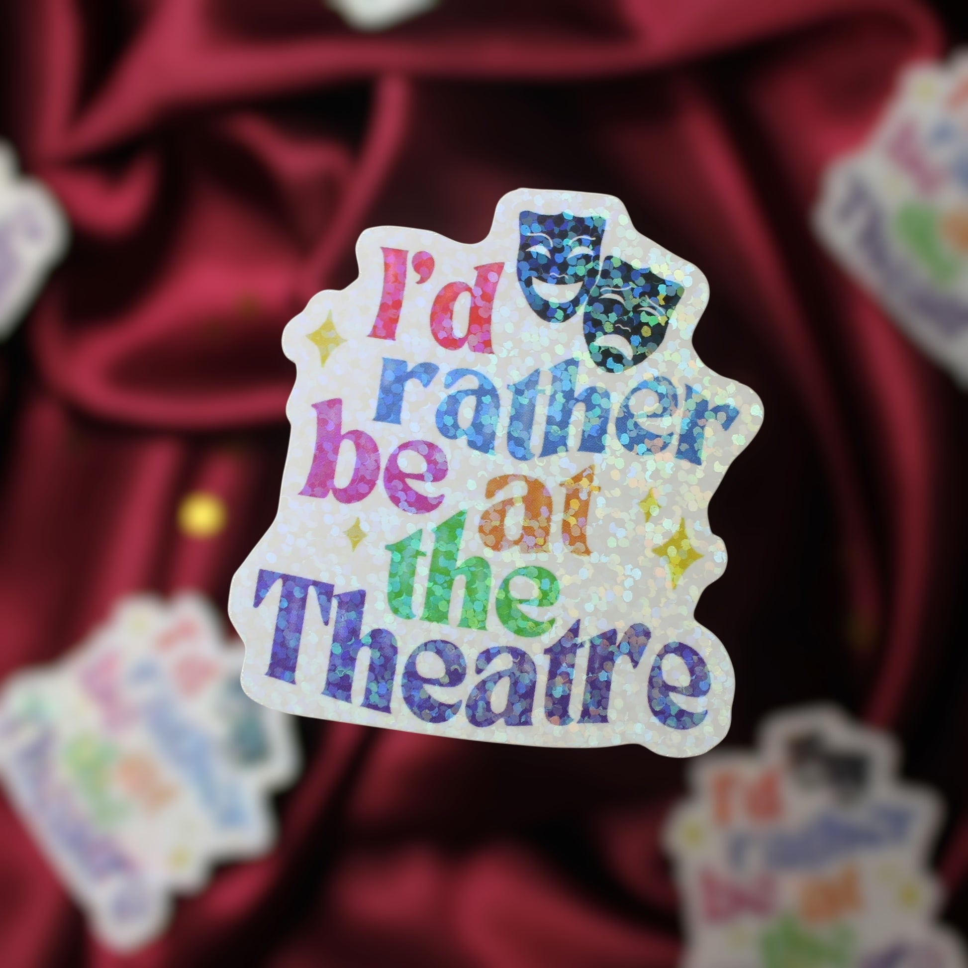 This sticker quotes ‘I’d rather be at the Theatre’ in a bold font with a holographic finish.