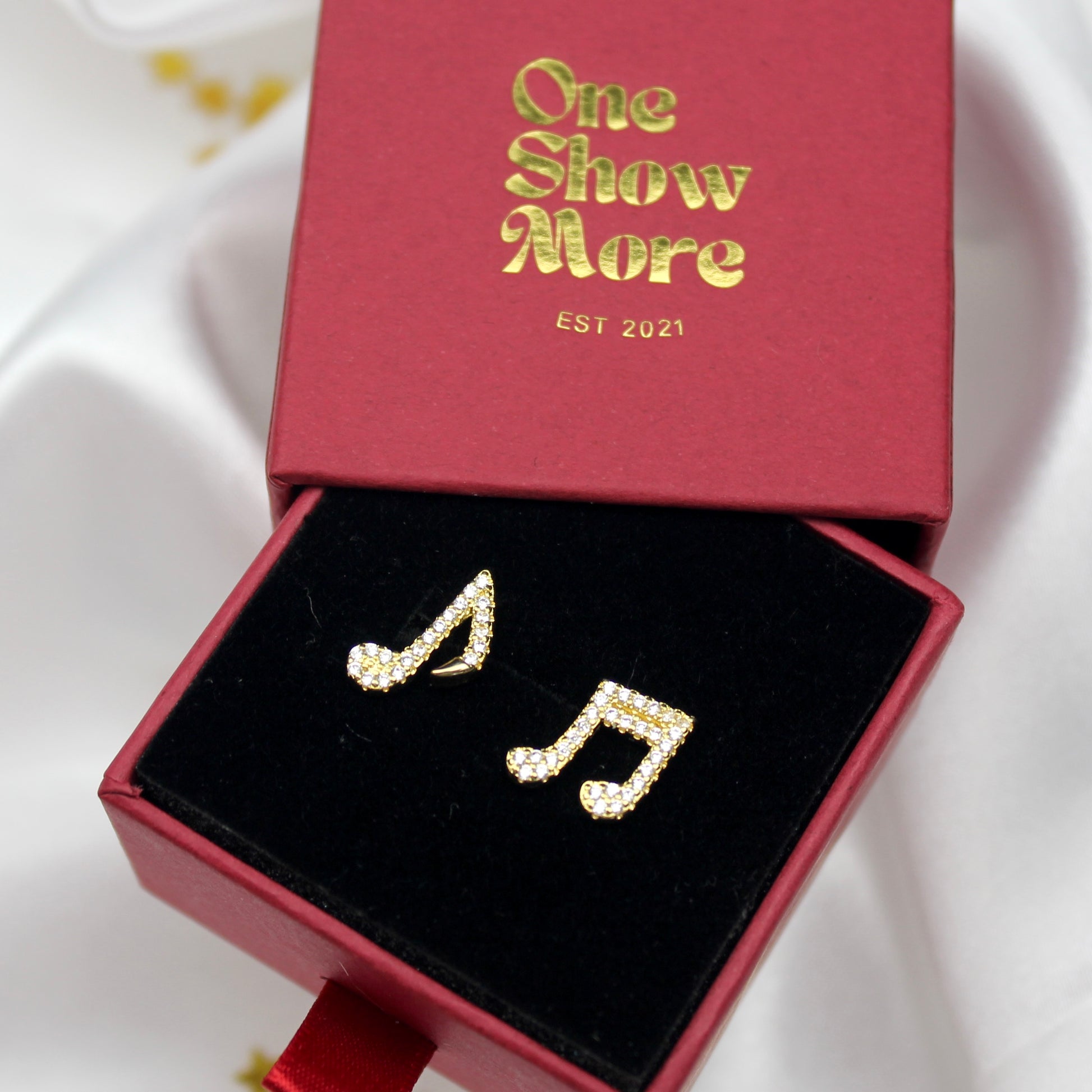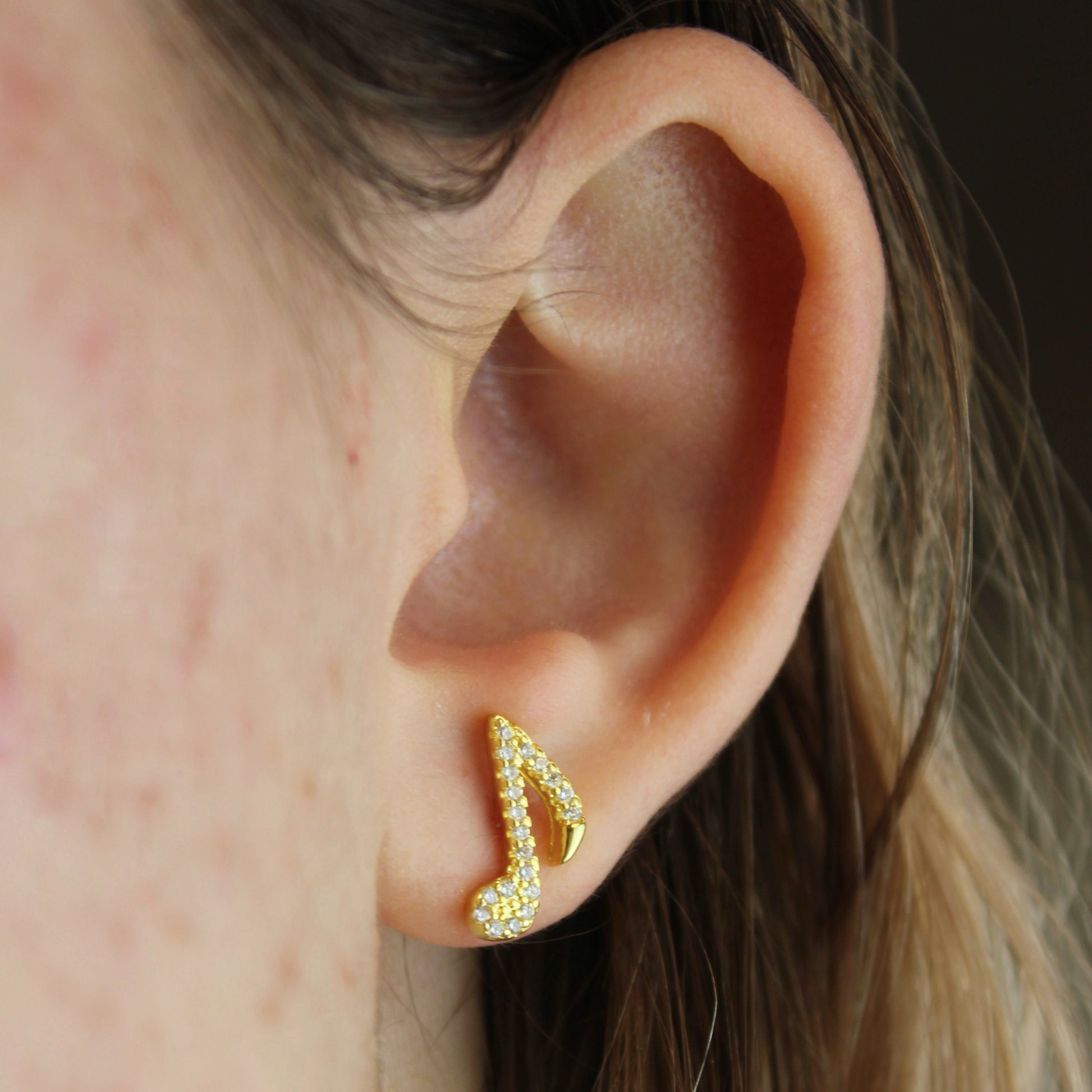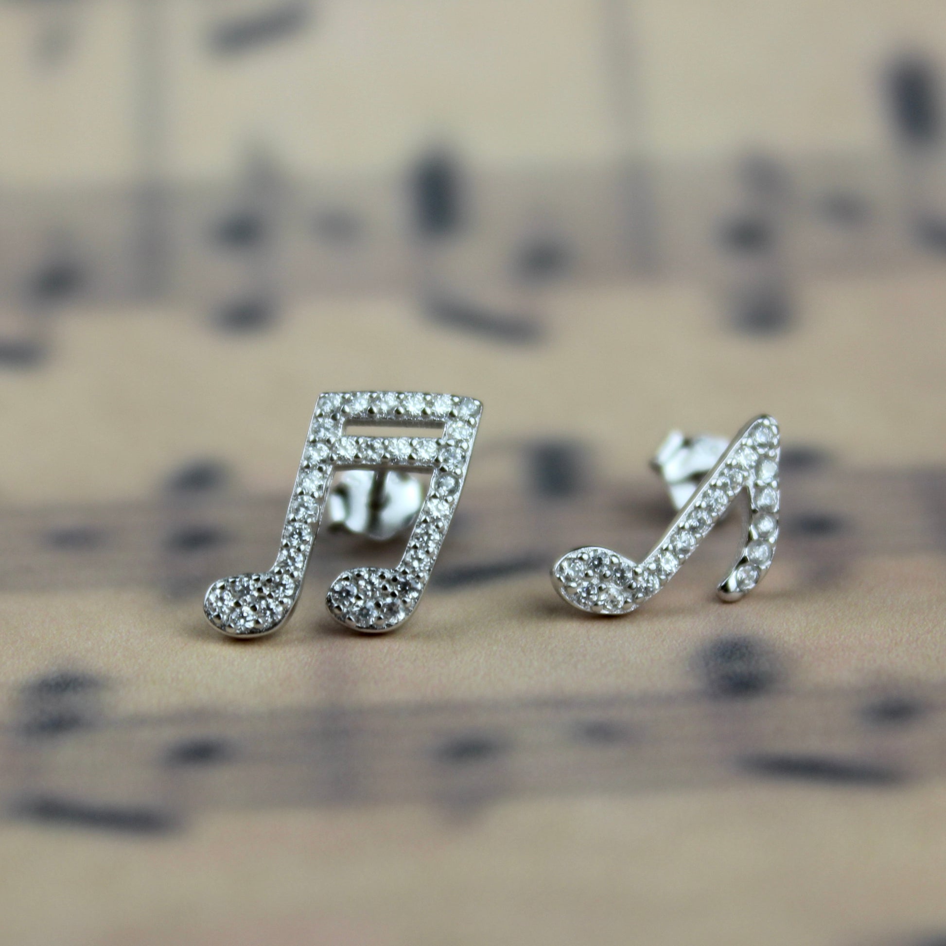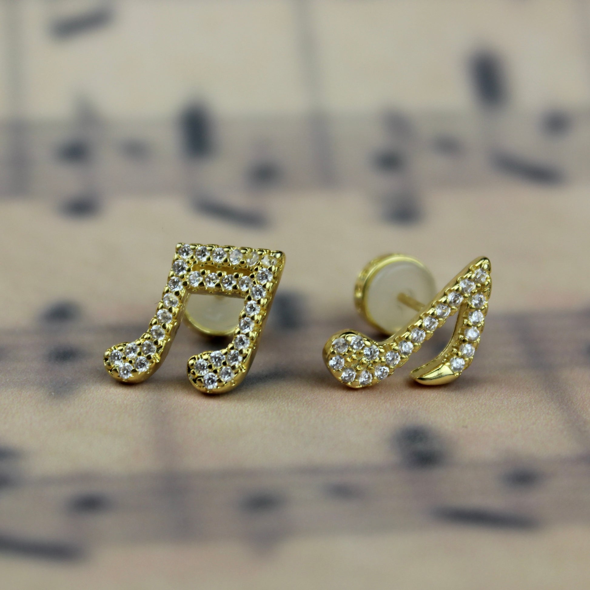 Mismatched music note earrings with cubic zirconia stones. Available with gold or silver finish.