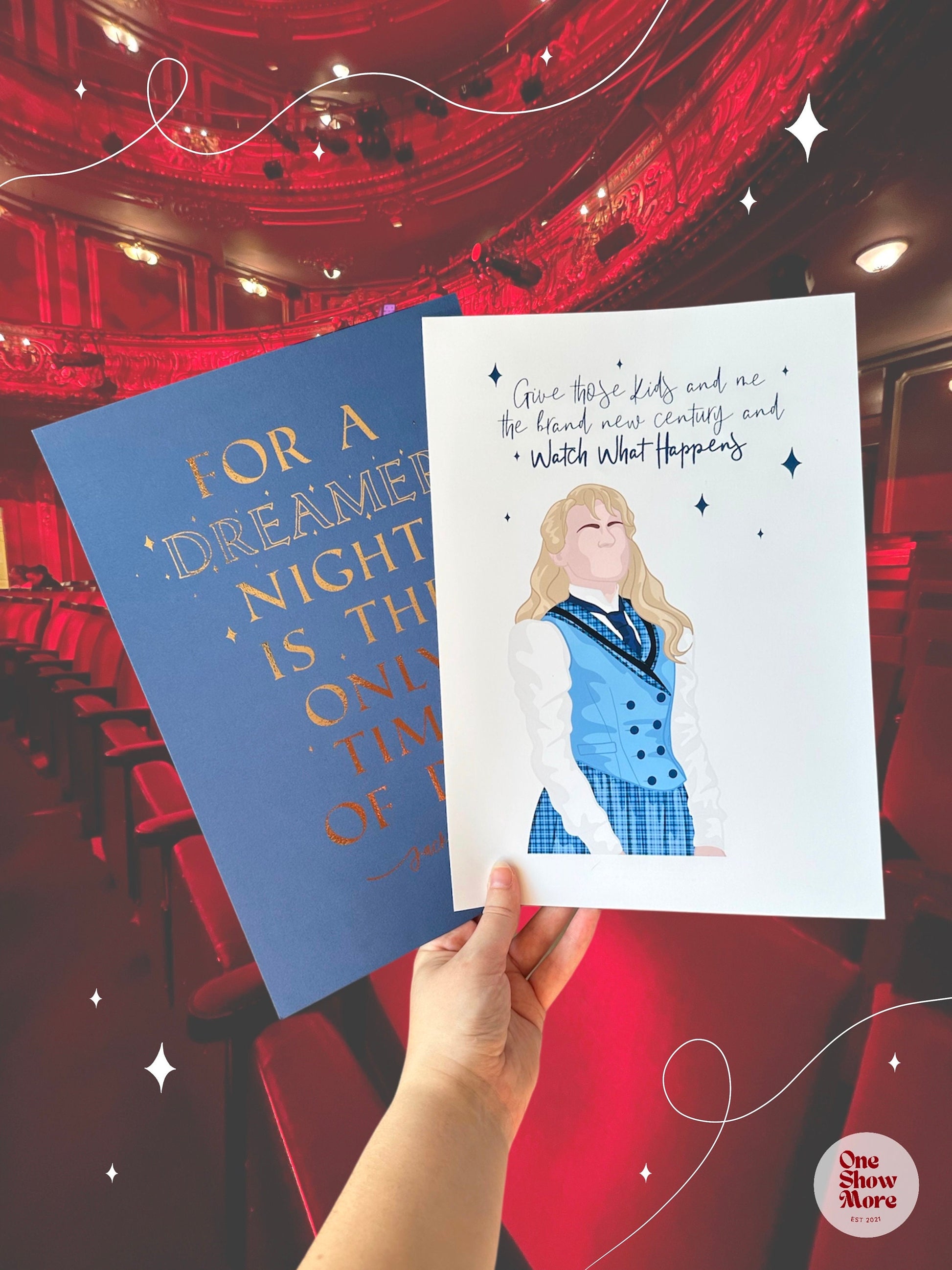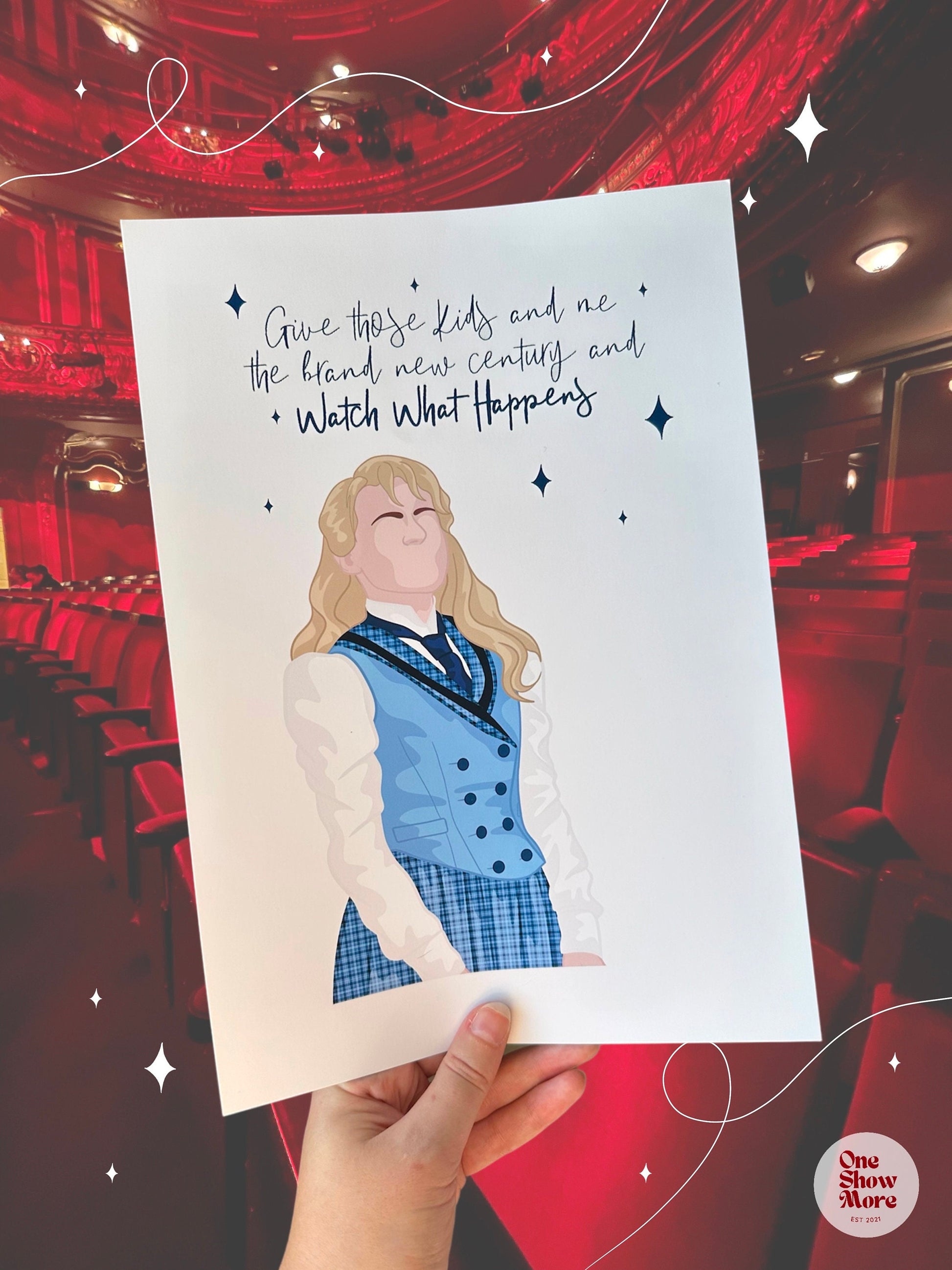 These print features a hand drawn image of Katherine Plumber with quotes from the musical and foil detailing. Printed on premium 230g card and hand foiled.