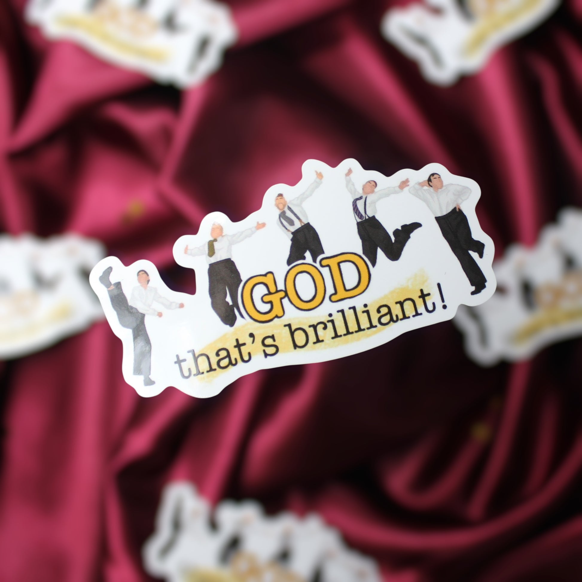This sticker pictures the full original west end cast of Operation Mincemeat The Musical in their classic curtain call poses.