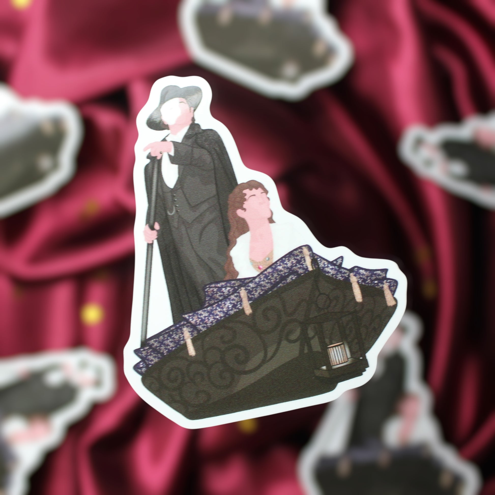 This sticker pictures Phantom and Christine from Phantom of the Opera The Musical with a glossy finish. Illustrations drawn by Vic from I can’t draw faces (@icant_drawfaces on Instagram).