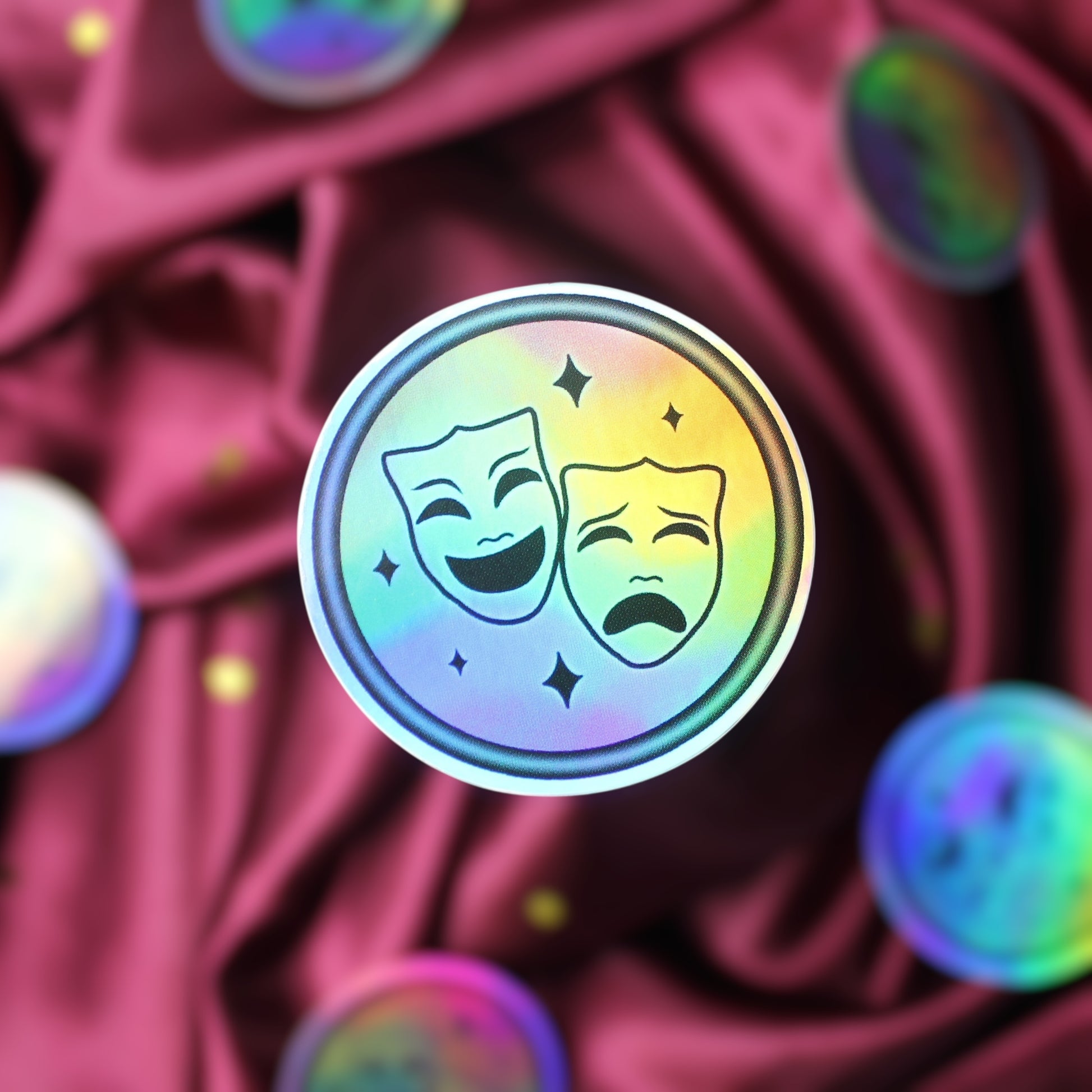 This sticker features our classic comedy and tragdey masks design with a rainbow holographic finish.