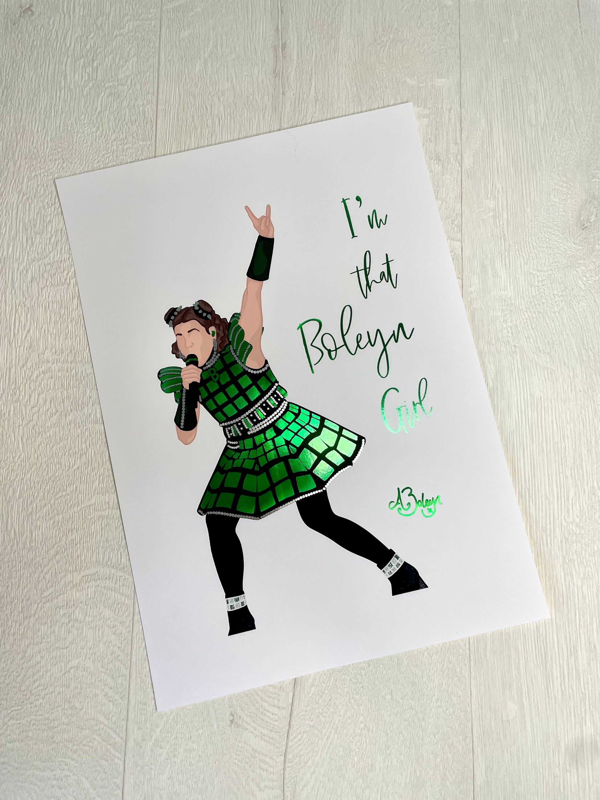 These print features a hand drawn image of your chosen queen with foil detailing on the costume with a song lyric also in foil detailing. Printed on premium 230g card and hand foiled.
