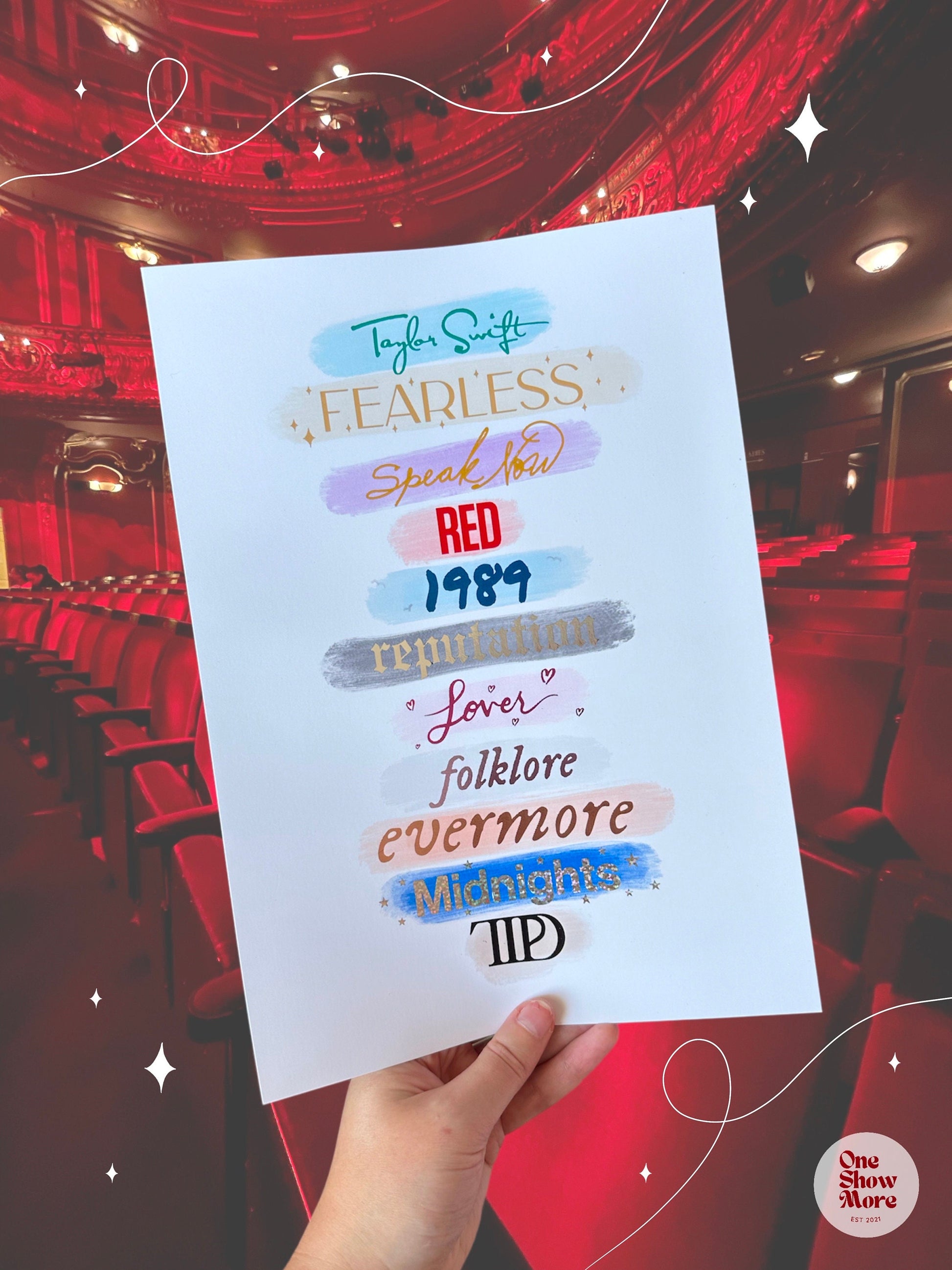 This print feature each of Taylor’s album titles with some extra sparkle.
