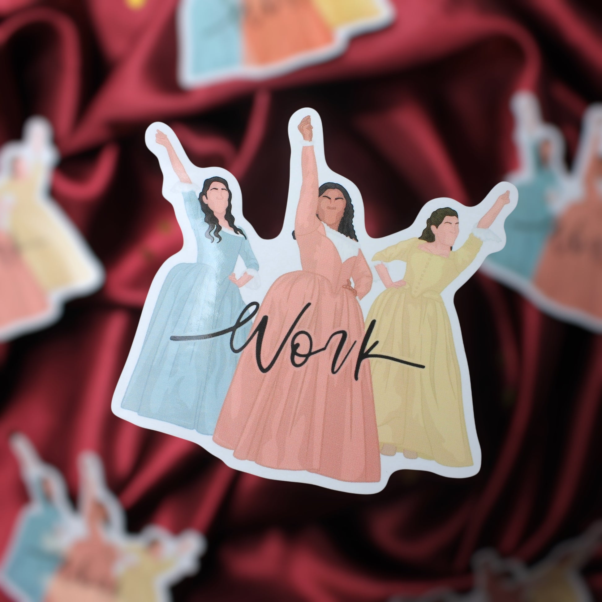 This sticker pictures The Skylar Sisters from Hamilton The Musical with a glossy finish. Illustrations drawn by Vic from I can’t draw faces (@icant_drawfaces on Instagram).