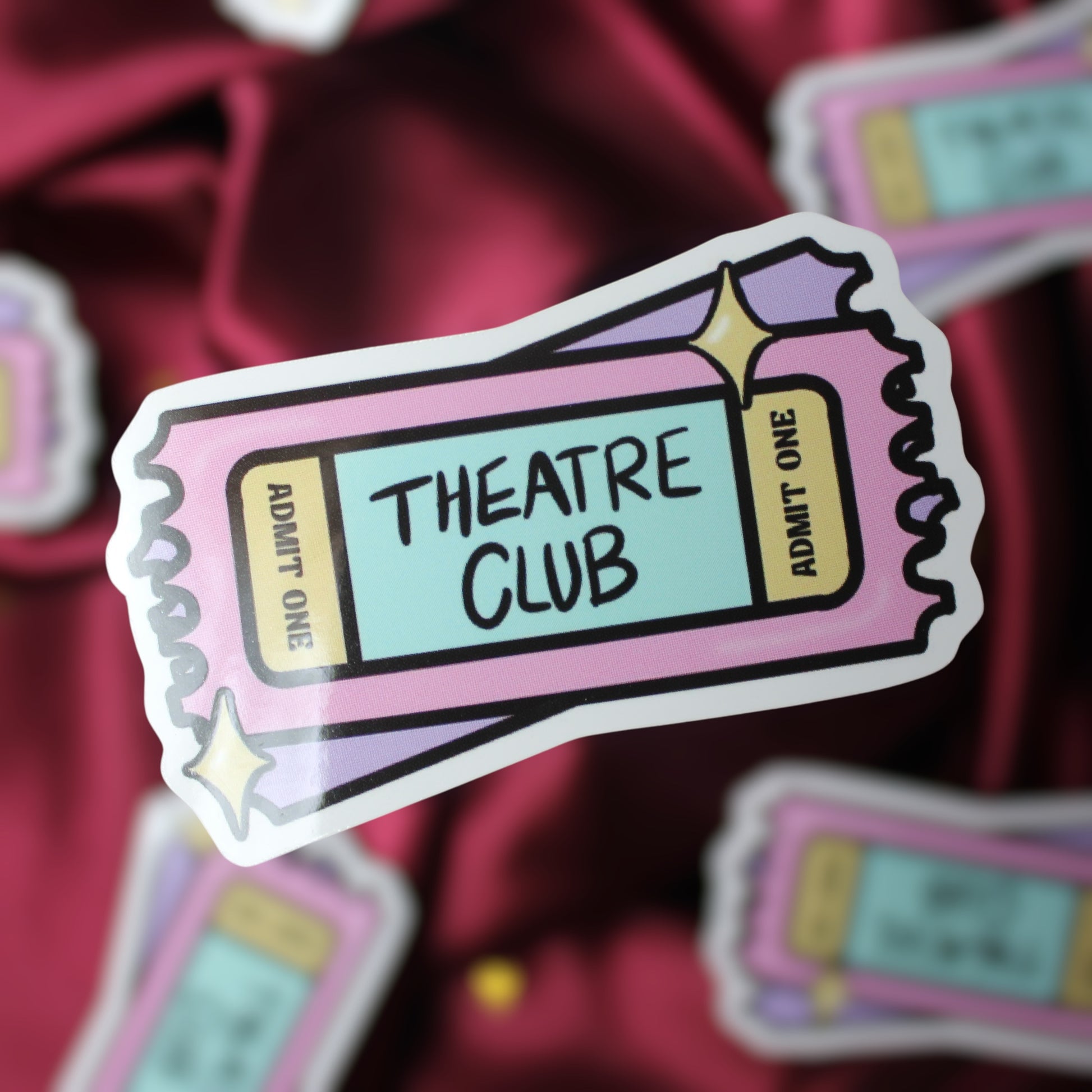 This sticker quotes ‘Theatre Club Admit One’ on a pastel coloured ticket stub shape with a glossy finish.