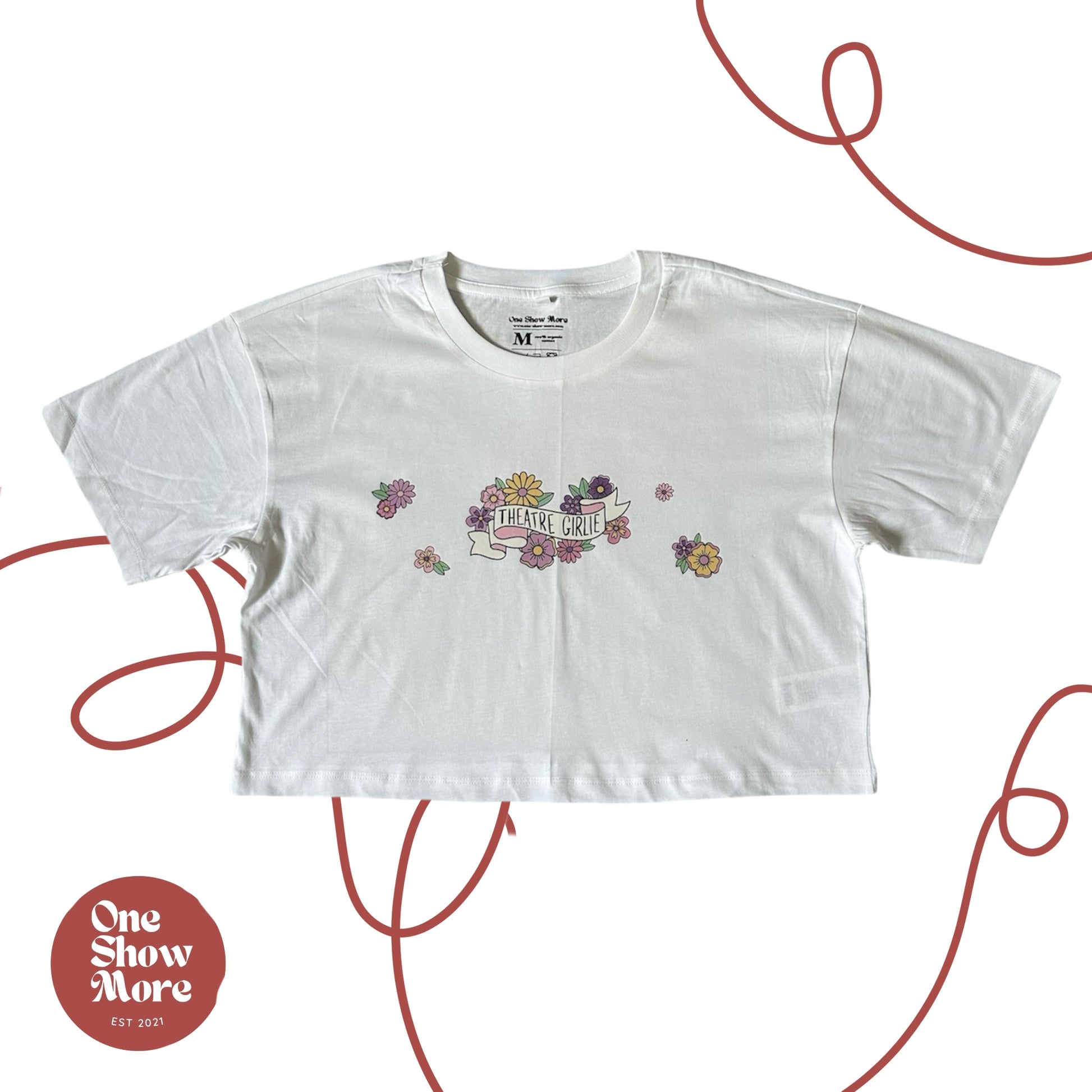 White cotton cropped T-shirt with our classic theatre girlie floral design printed on the chest. Available in sizes small to large.