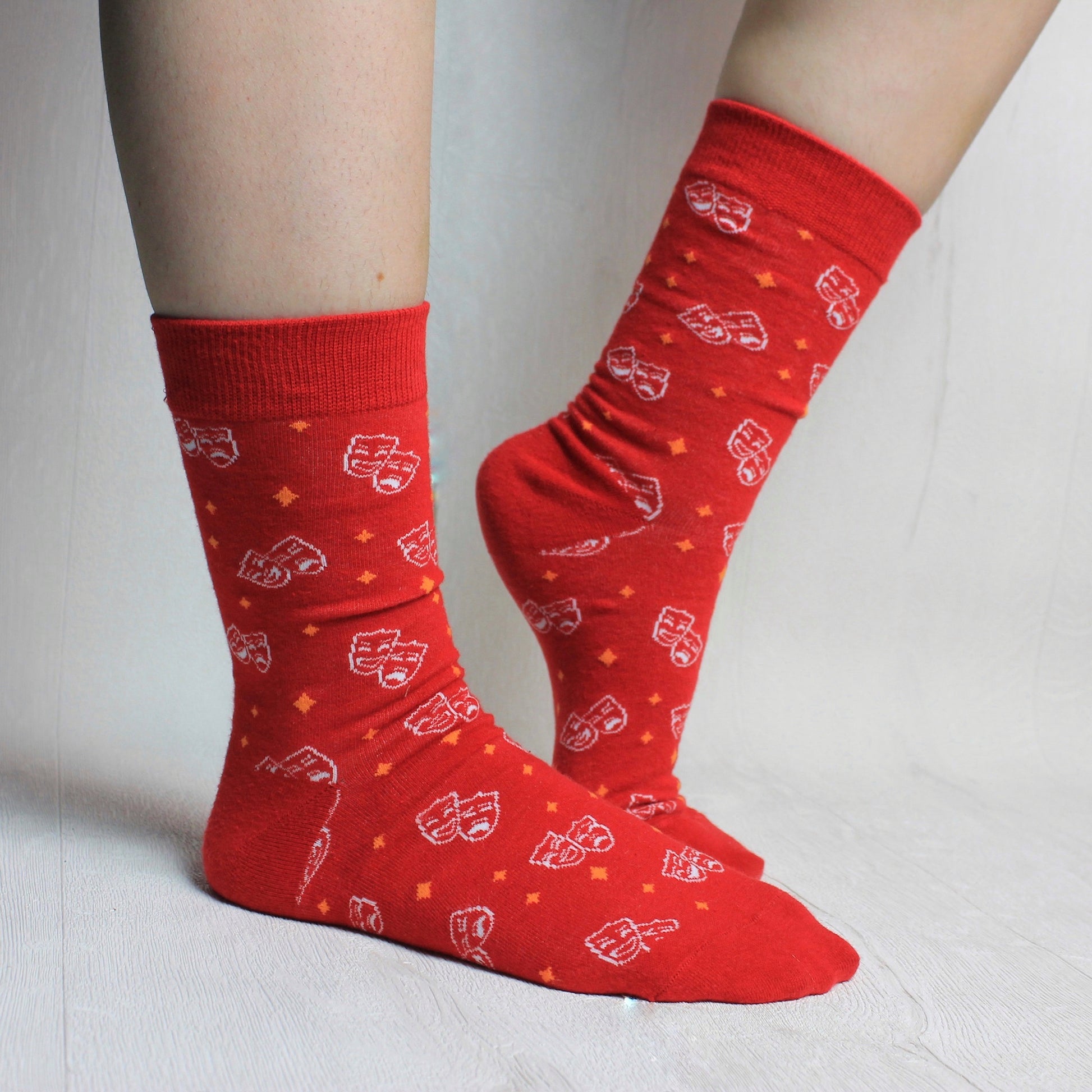 These theatre themed crew socks feature comedy and tragedy masks with sparkles.
