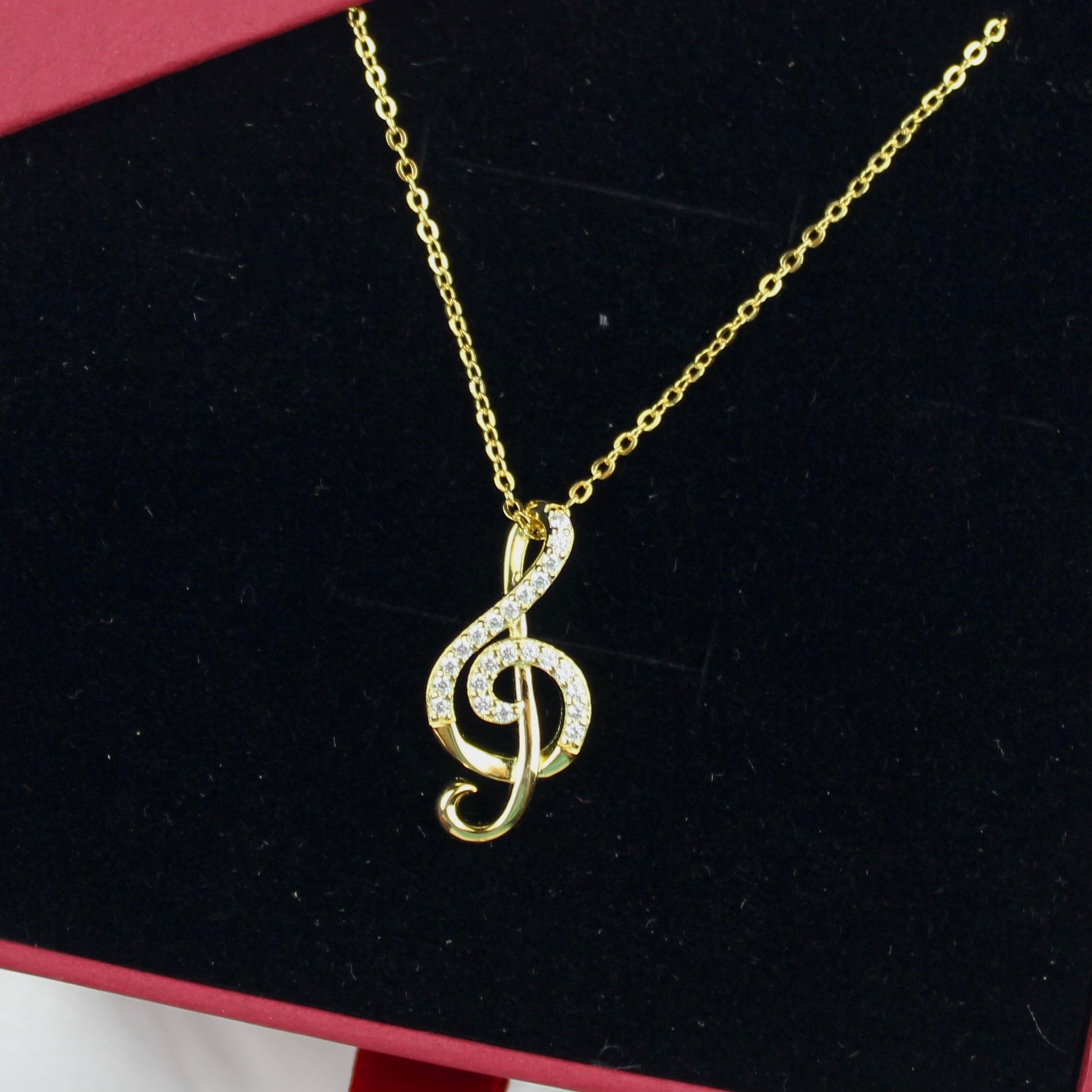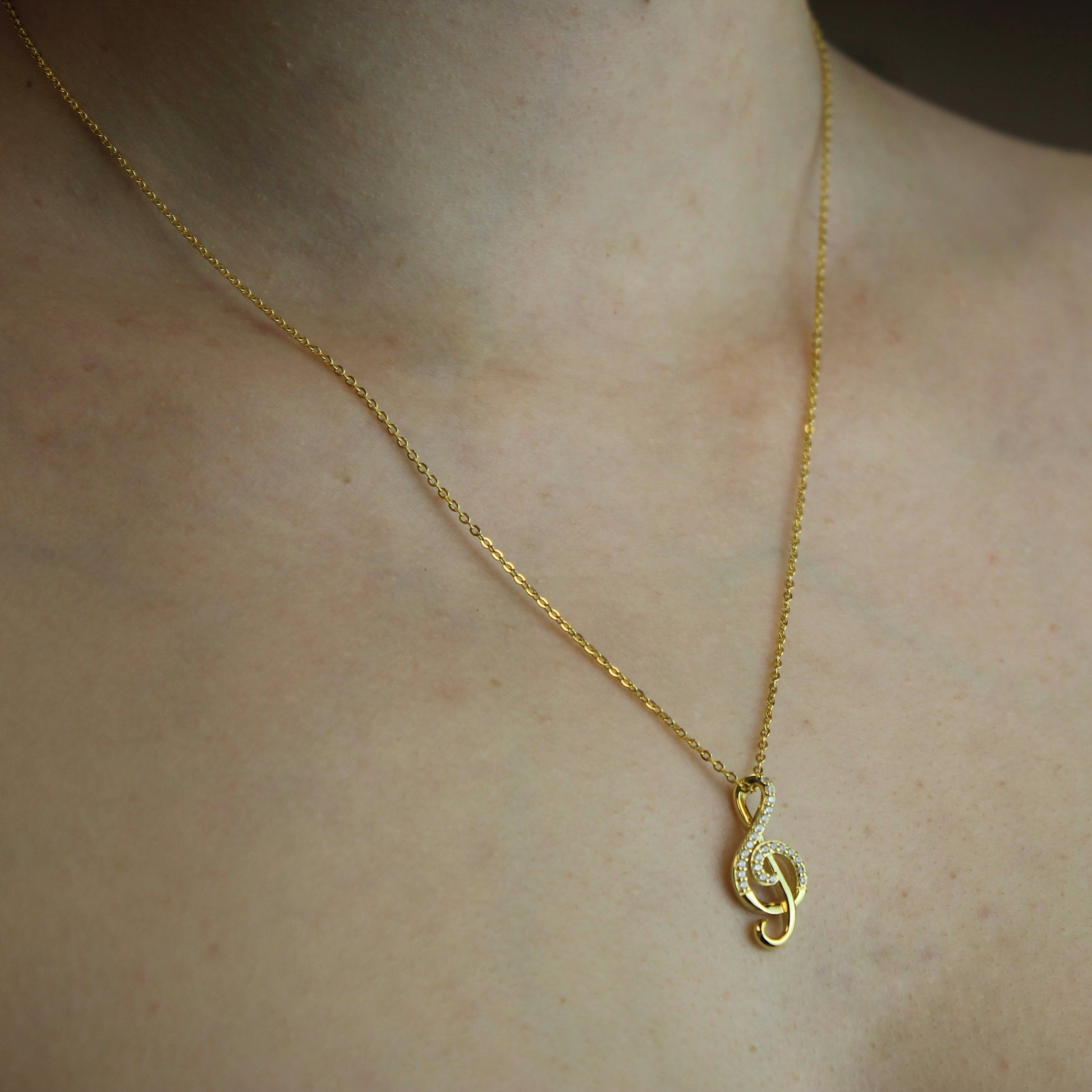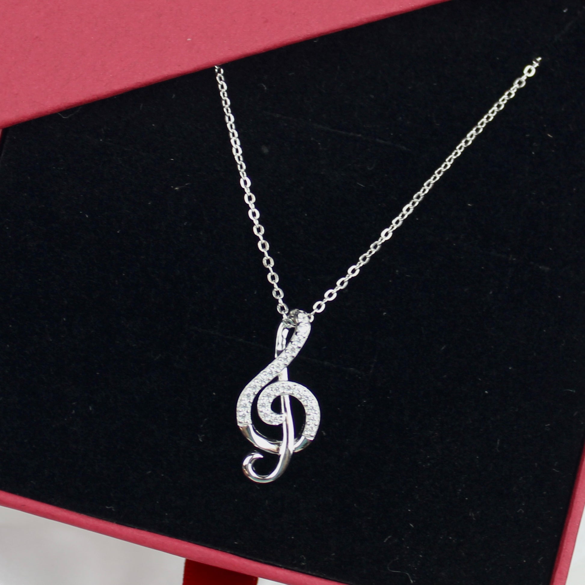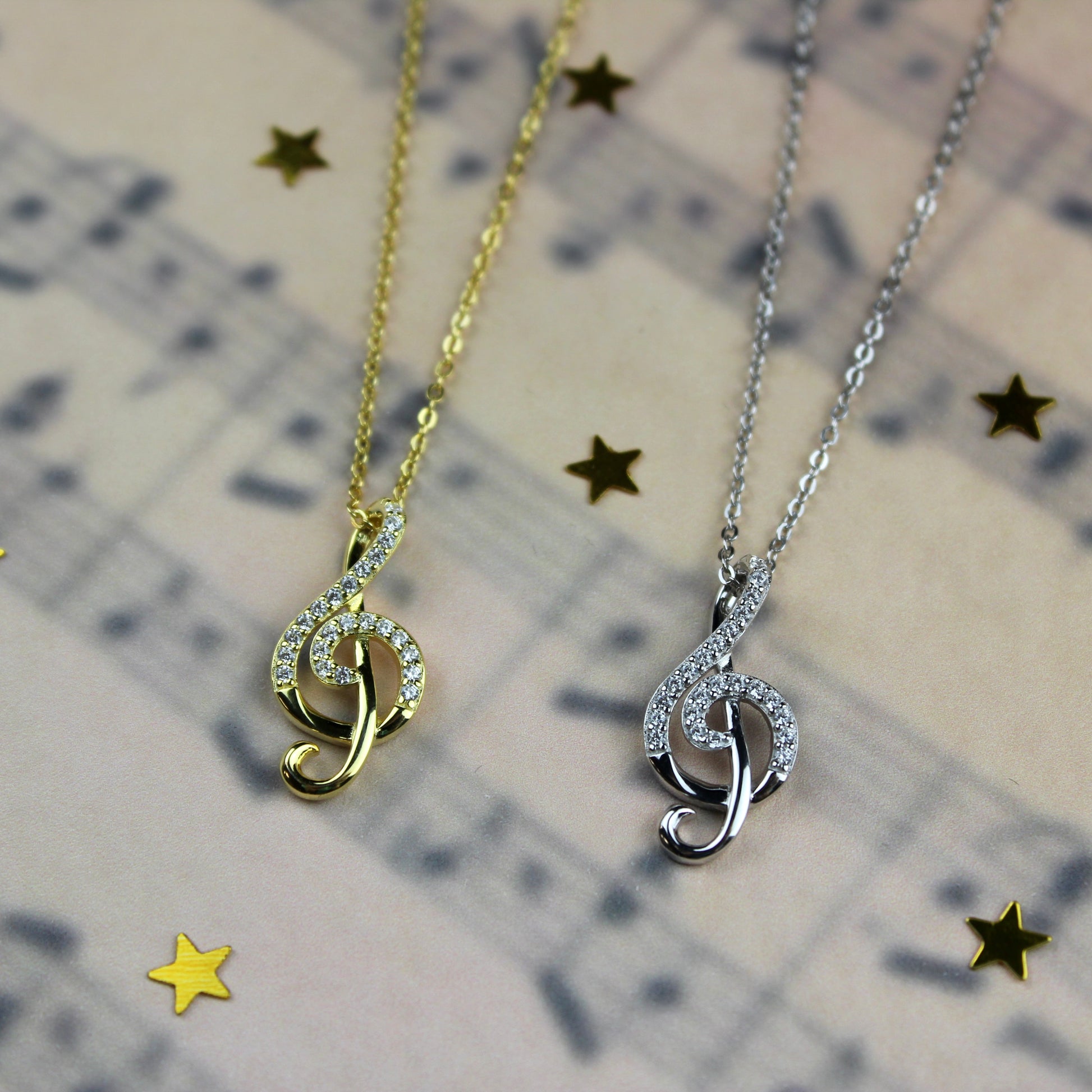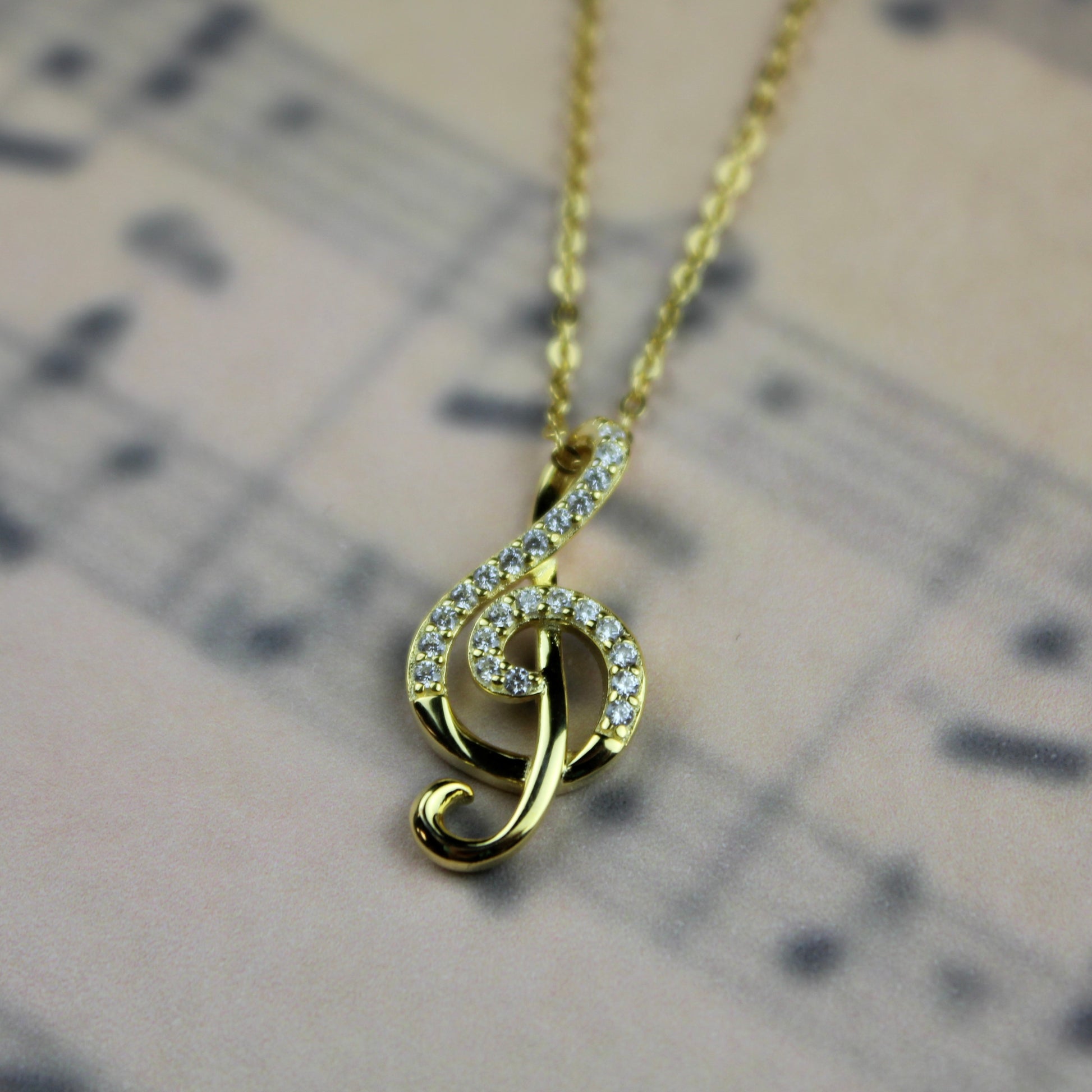 Sterling silver chain necklace with treble clef charm finished in gold or silver with cubic zirconia stones.