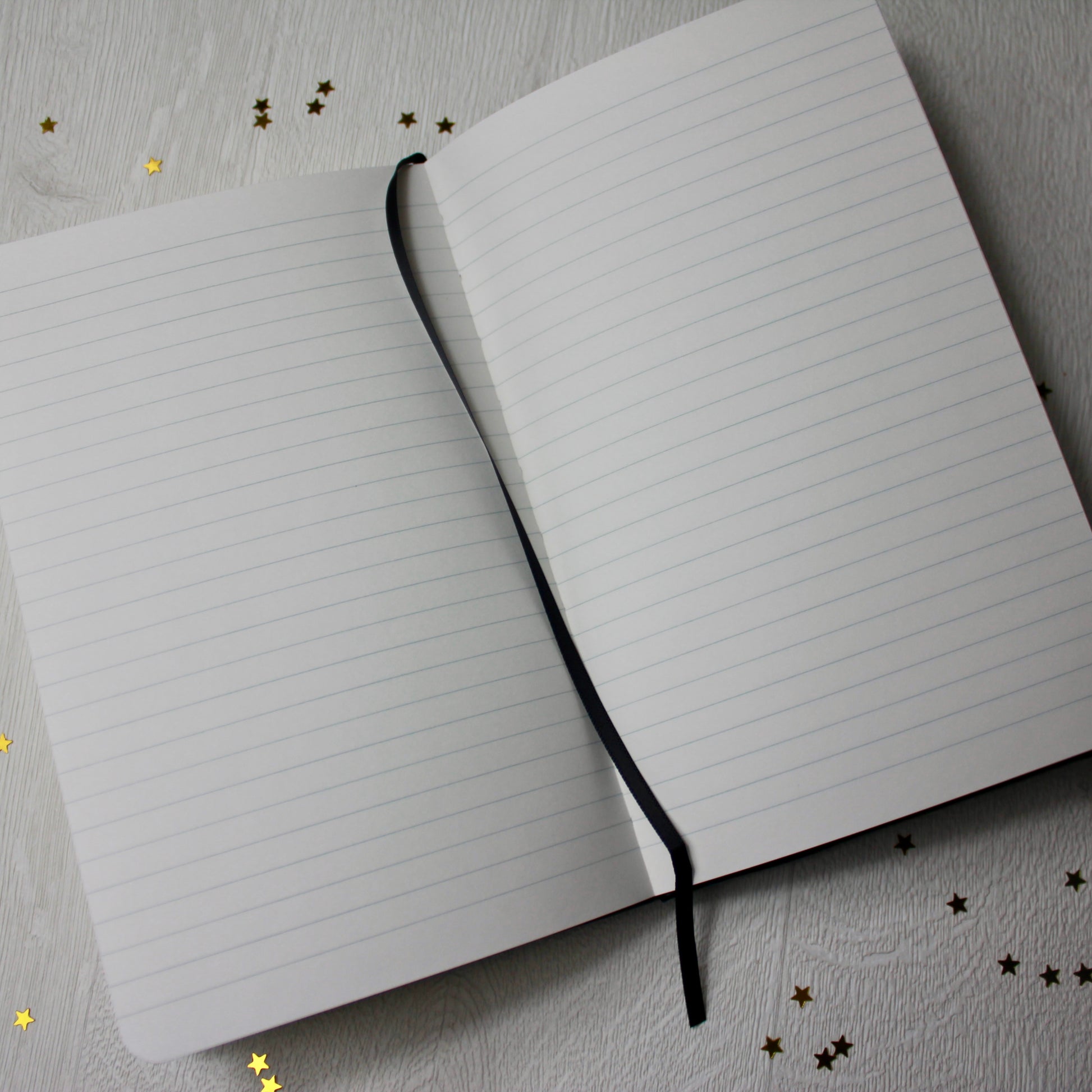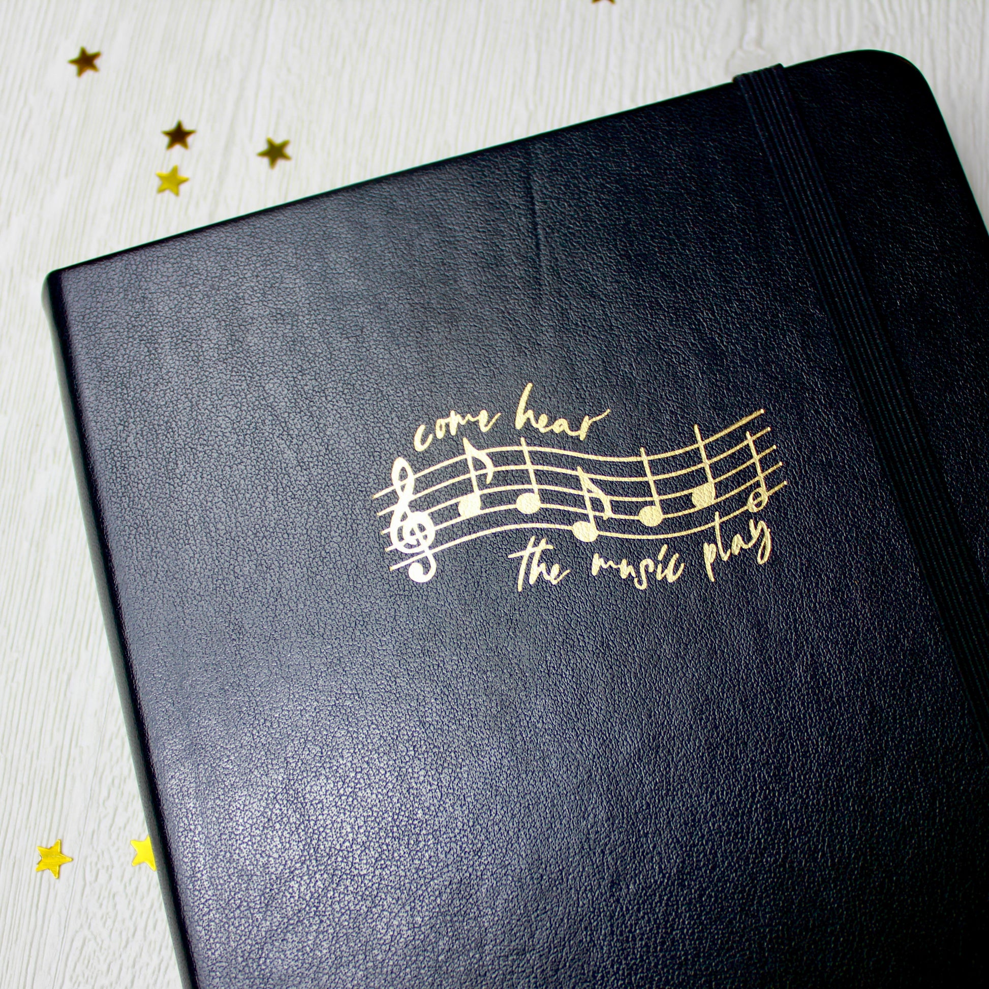 This A5 vegan leather bound notebook has 192 lined pages. A black cover with a small drawing od musical note stave and the lyrics ‘come hear the music play’ in gold foil. The notebook has a pocket on the back cover for you to store loose paper and an elastic band to keep it closed.