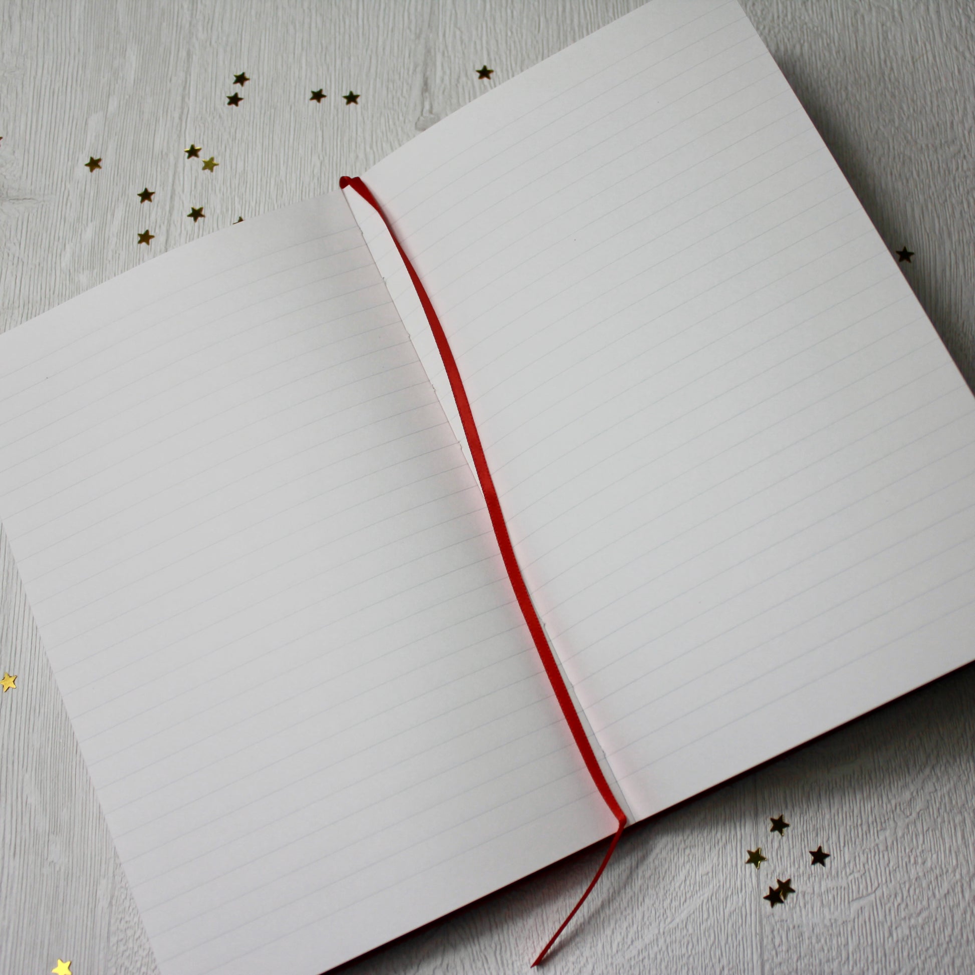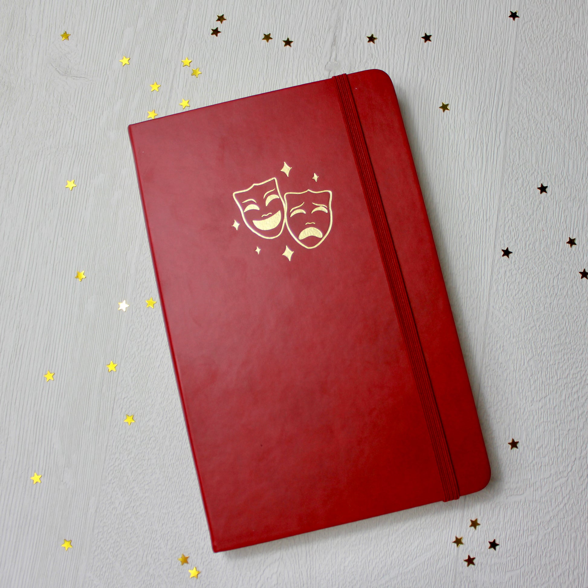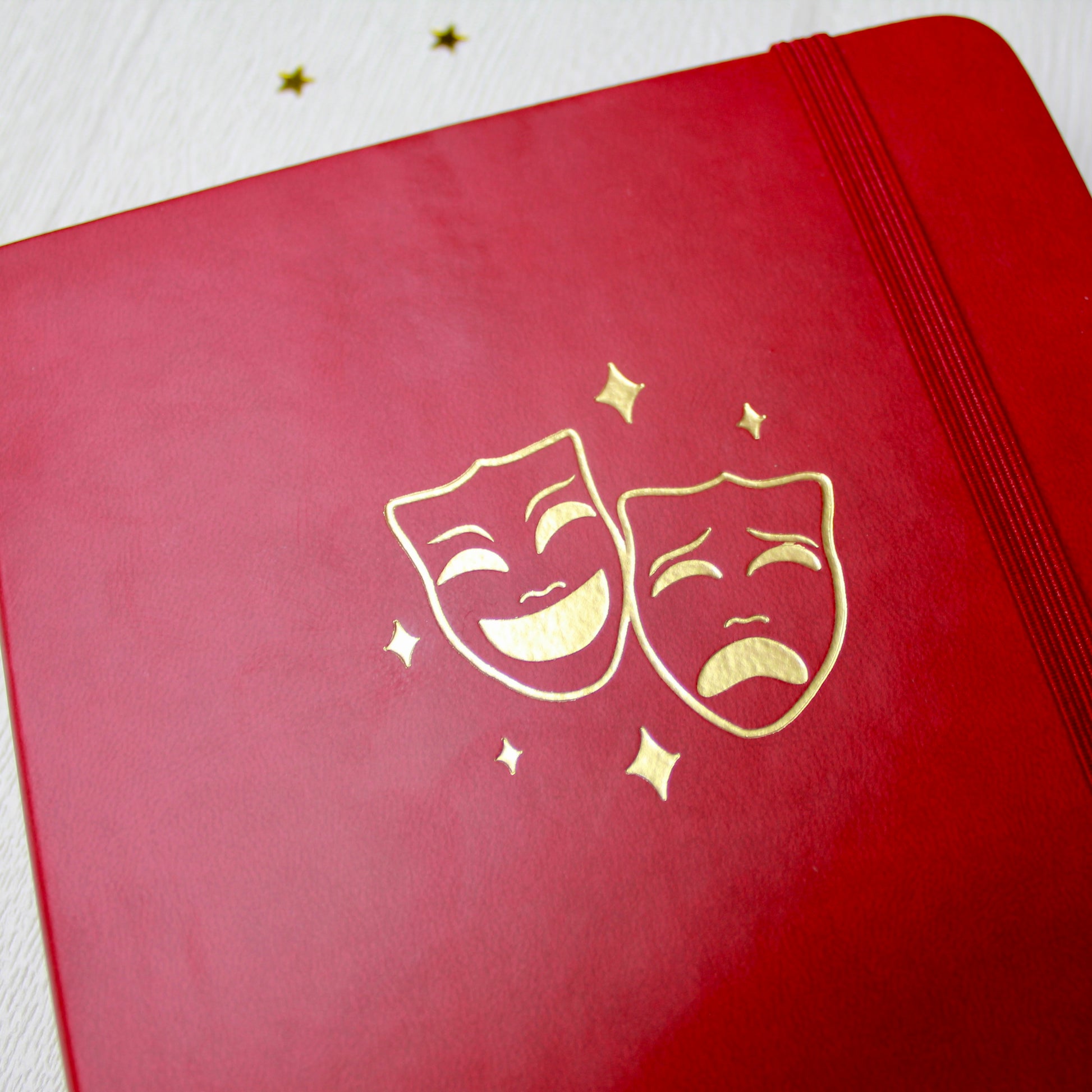 This A5 vegan leather bound notebook has 192 lined pages. A burgundy cover with a small line drawing of comedy and tragedy masks stamped in gold foil. The notebook has a pocket on the back cover for you to store loose paper and an elastic band to keep it closed.