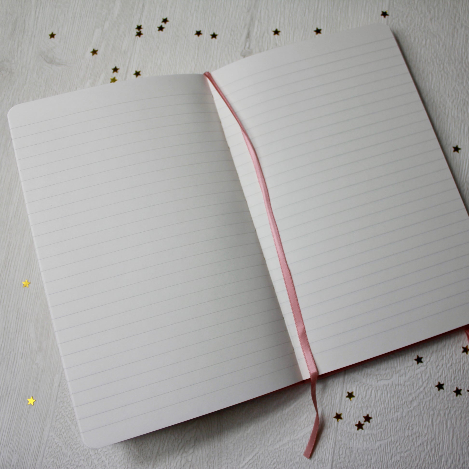 This A5 vegan leather bound notebook has 192 lined pages. The notebook has a pocket on the back cover for you to store loose paper and an elastic band to keep it closed.