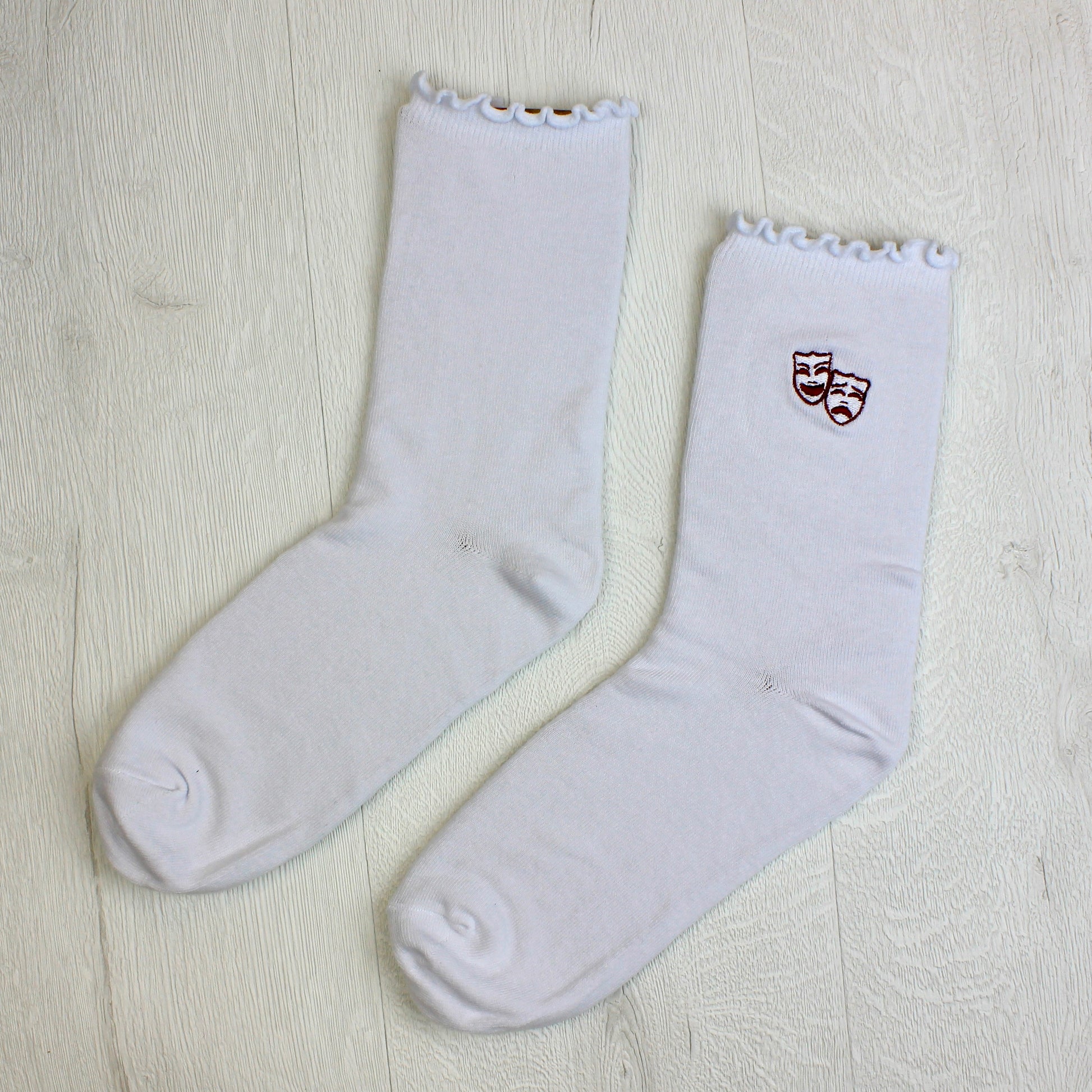 These theatre themed crew socks feature comedy and tragedy masks embroidered on the outside of each sock and a lettuce hem.